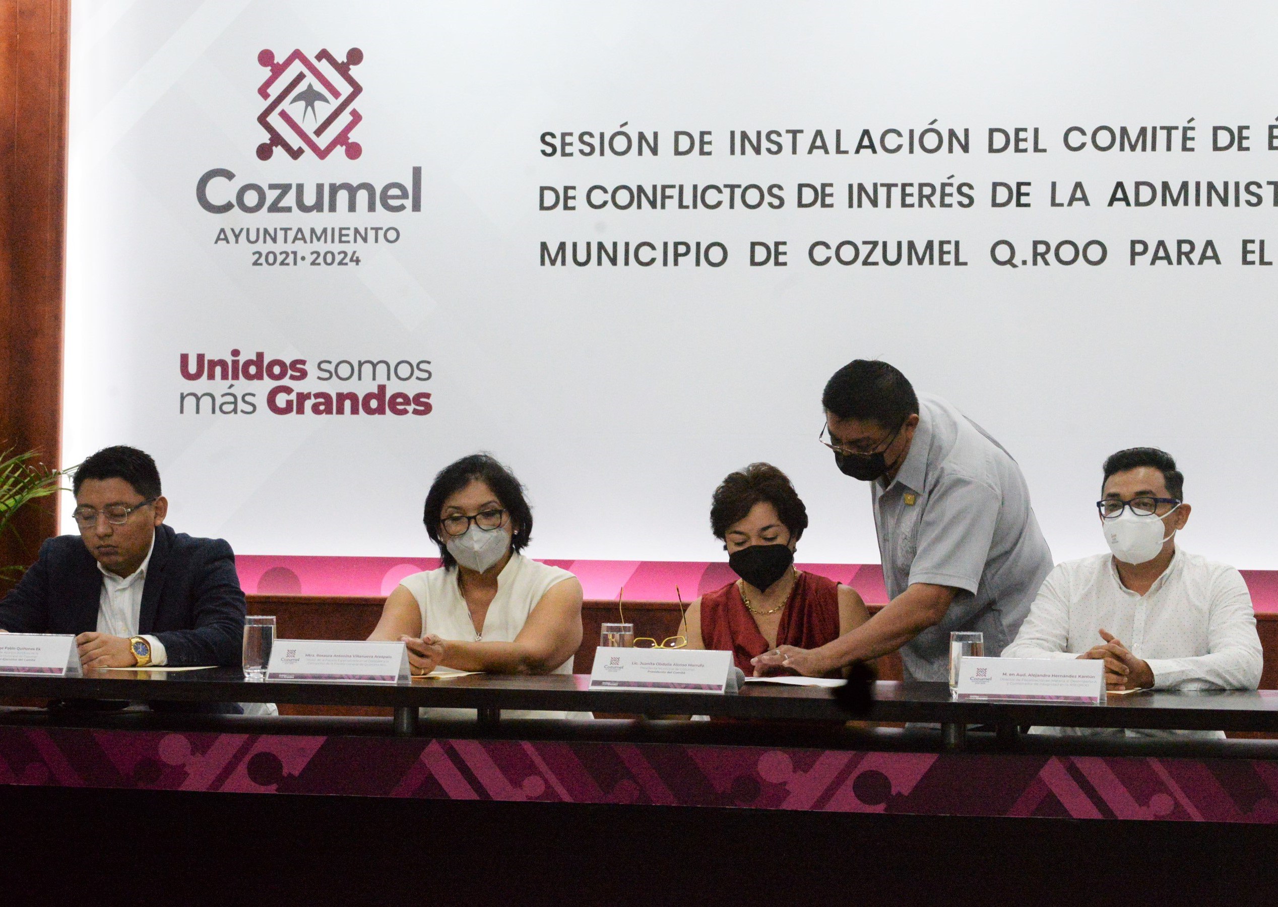El Comité queda integrado como Presidente del Comité, Juanita Alonso Marrufo, Presidenta Municipal de Cozumel; Vicepresidente del Comité, Carlos Isabel Mendoza Quijano, Contralor Municipal de Cozumel; Secretario Ejecutivo, Jorge Pablo Quiñones Ek, Director de Asuntos Jurídicos de la Contraloría Municipal de Cozumel y como vocales la Tercera y Noveno Regidor, Fabiola Aislinn Chávez Brito y Miguel Ángel Cante Ávila, respectivamente, así como Gerandily de Jesús Gutiérrez Poot, Directora De Recursos Humanos y Layda del Carmen Llanes Ku, Directora Jurídica del Municipio de Cozumel.