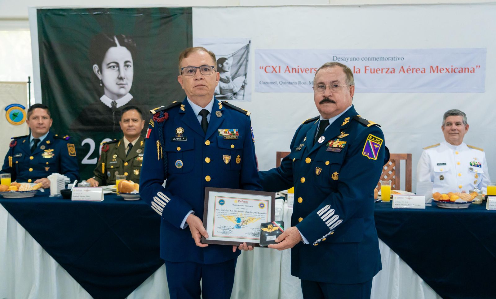 El evento se llevó a cabo en las instalaciones de la Fuerza Aérea Militar, donde como parte de la ceremonia, el general de división P.A.D.E.M.A. retirado, Víctor Manuel Ruesga Ramírez, entregó al comandante de la Base Aérea Militar, Román Eduardo Ajuria Benavides, el documento que autoriza portar las Alas de Pecho con estrellas y laurel, distinción otorgada por haber acumulado más de tres mil horas de vuelo a lo largo de su trayectoria como piloto militar.