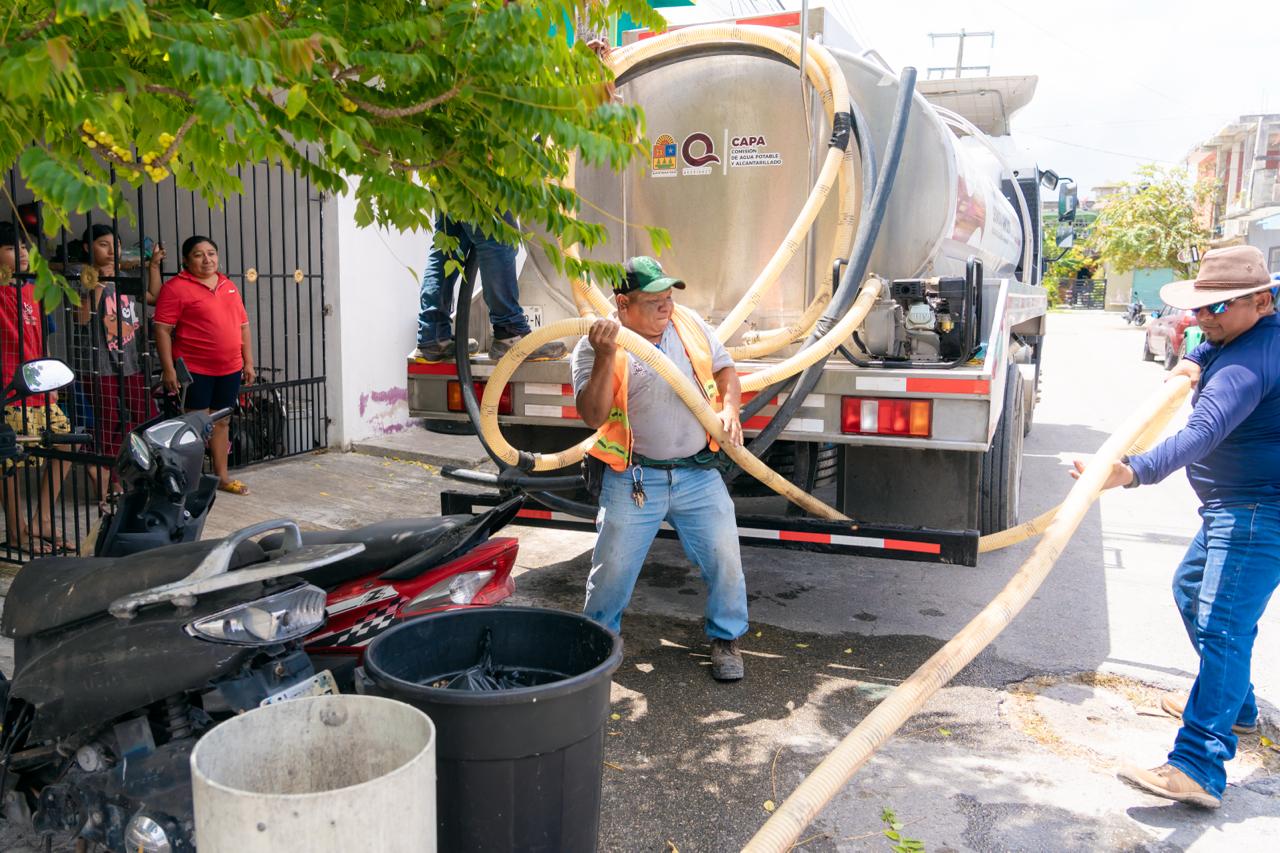 El gobierno municipal que encabeza José Luis Chacón Méndez continúa con la entrega de agua en apoyo a la Comisión de Agua Potable y Alcantarillado (CAPA), en beneficio de los hogares cozumeleños, por lo que se mantiene la distribución del vital líquido mediante pipas en diversas colonias de la isla.