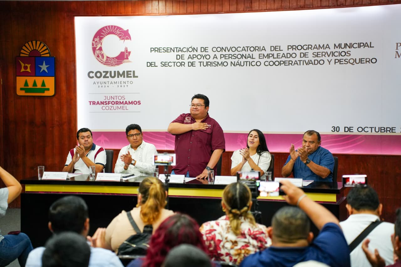 El presidente municipal José Luis Chacón Méndez presentó la convocatoria del “Programa municipal de apoyo a personal empleado en los servicios del sector turístico, náutico, cooperativado y pesquero de la Isla de Cozumel”, con el objetivo de fortalecer la economía de las familias que dependen de estas actividades productivas, mediante la entrega de apoyos económicos durante los periodos en los que se reducen las oportunidades laborales y los ingresos, al tiempo que se fomenta la conservación y reproducción de las especies marinas.