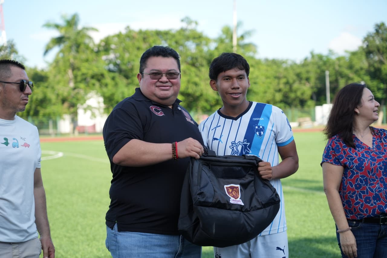 La tarde de este viernes, el presidente municipal, José Luis Chacón Méndez, en compañía de los patrocinadores, realizó la entrega simbólica de kits compuestos por una maleta e uniformes a los jugadores y cuerpo técnico del equipo de tercera división “Guerreros Cozumel FC”, quienes mañana viajan a Cancún para disputar su primer encuentro de la temporada 2025-2026 de la Liga TDP.