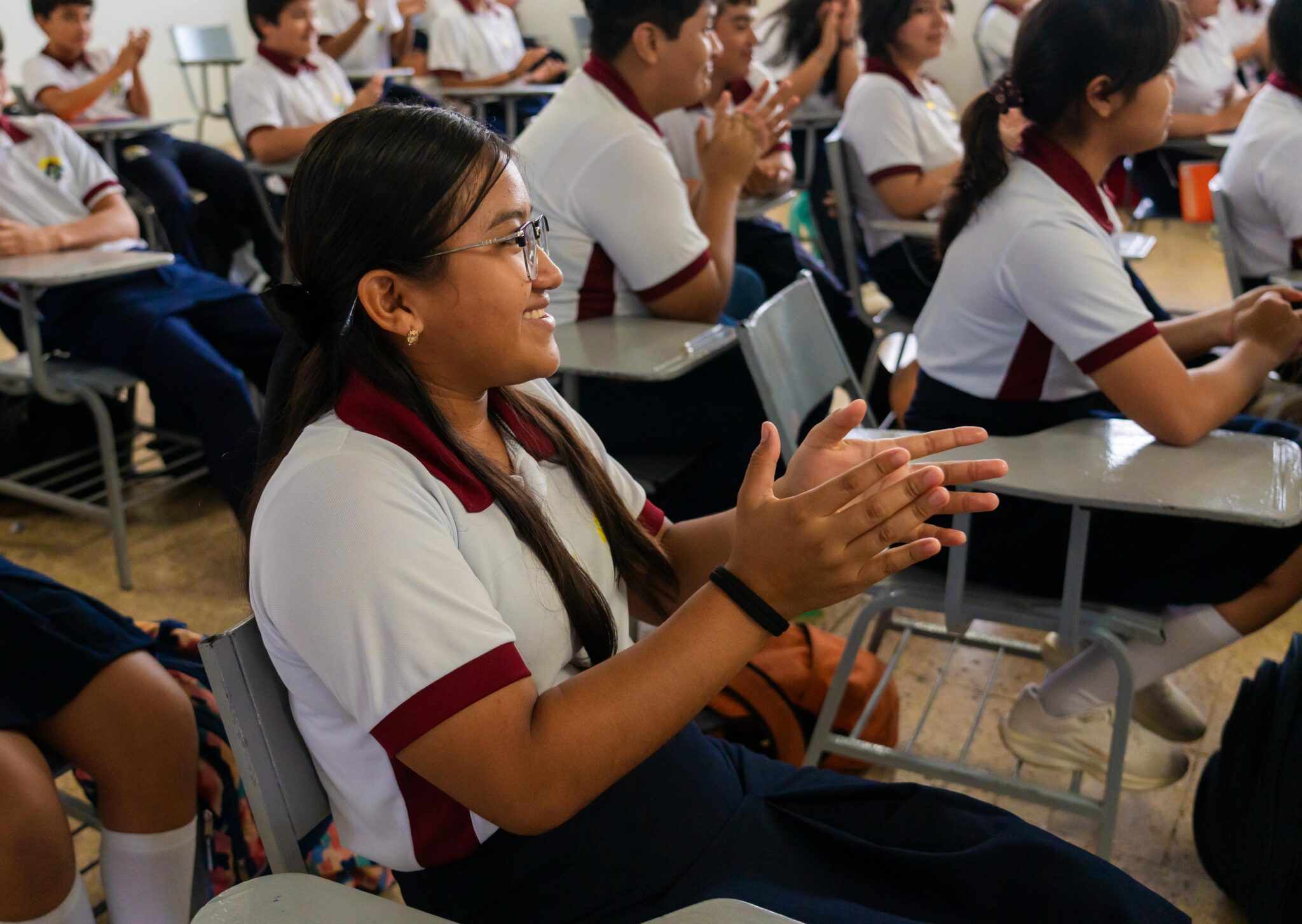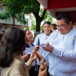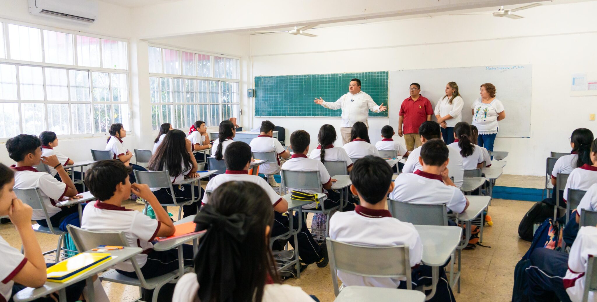 En compañía de la directora del colegio, Anny Beatriz Almeida Cetina, el presidente municipal ingresó a los salones de los grados tercero B y C, donde explicó a las y los estudiantes el objetivo de su gobierno: “Ustedes y sus profesores merecen calidad educativa. Todos ustedes merecen estar cómodos; esto es un tema de justicia social, porque queremos que no sufran lo que nosotros sufrimos cuando estudiamos, que estén contentos y cómodos para que le sigan echando ganas al estudio”, expresó el edil.