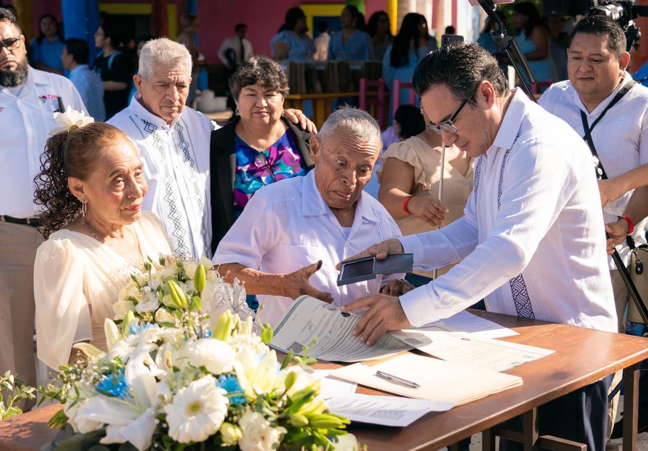 Asimismo, realizó un reconocimiento especial al Sr. Mario Poot Aké y a la Sra. María Delia Adame Parra, por ser la pareja de mayor edad en esta ceremonia, subrayando que su ejemplo recuerda que el amor no tiene edad y que siempre es tiempo de decir sí.