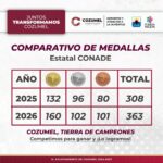 La meta a superar eran las 308 medallas obtenidas en 2025, cifra que hoy queda atrás gracias al respaldo del gobierno municipal el apoyo del gobierno del Estado que encabeza la gobernadora Mara Lezama, la suma de esfuerzos de la iniciativa privada, el compromiso de los padres de familia y, sobre todo, la disciplina y entrega de las y los atletas cozumeleños, quienes colocaron a la isla en lo más alto del medallero estatal con 363 preseas.