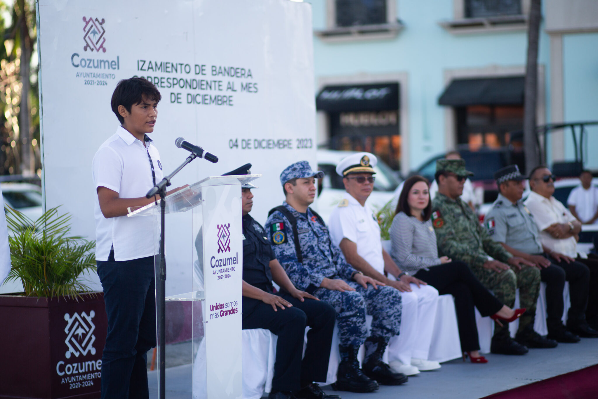 A fin de fomentar los valores cívicos en la sociedad cozumeleña, la mañana de este lunes se efectuó la ceremonia de Izamiento del Lábaro Patrio, correspondiente al mes de diciembre, encabezado por la presidenta municipal, Juanita Alonso Marrufo y autoridades militares en la explanada de la bandera.