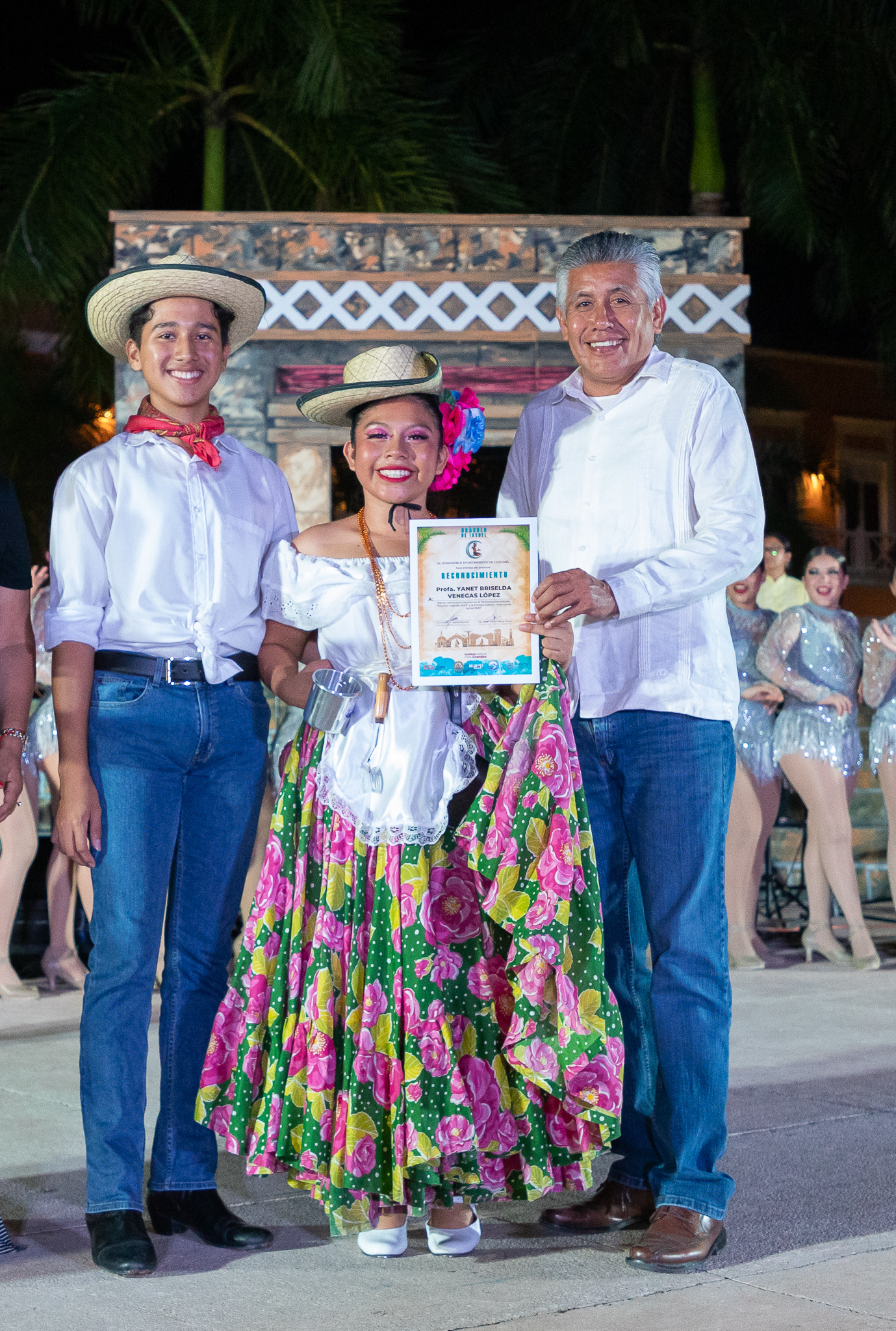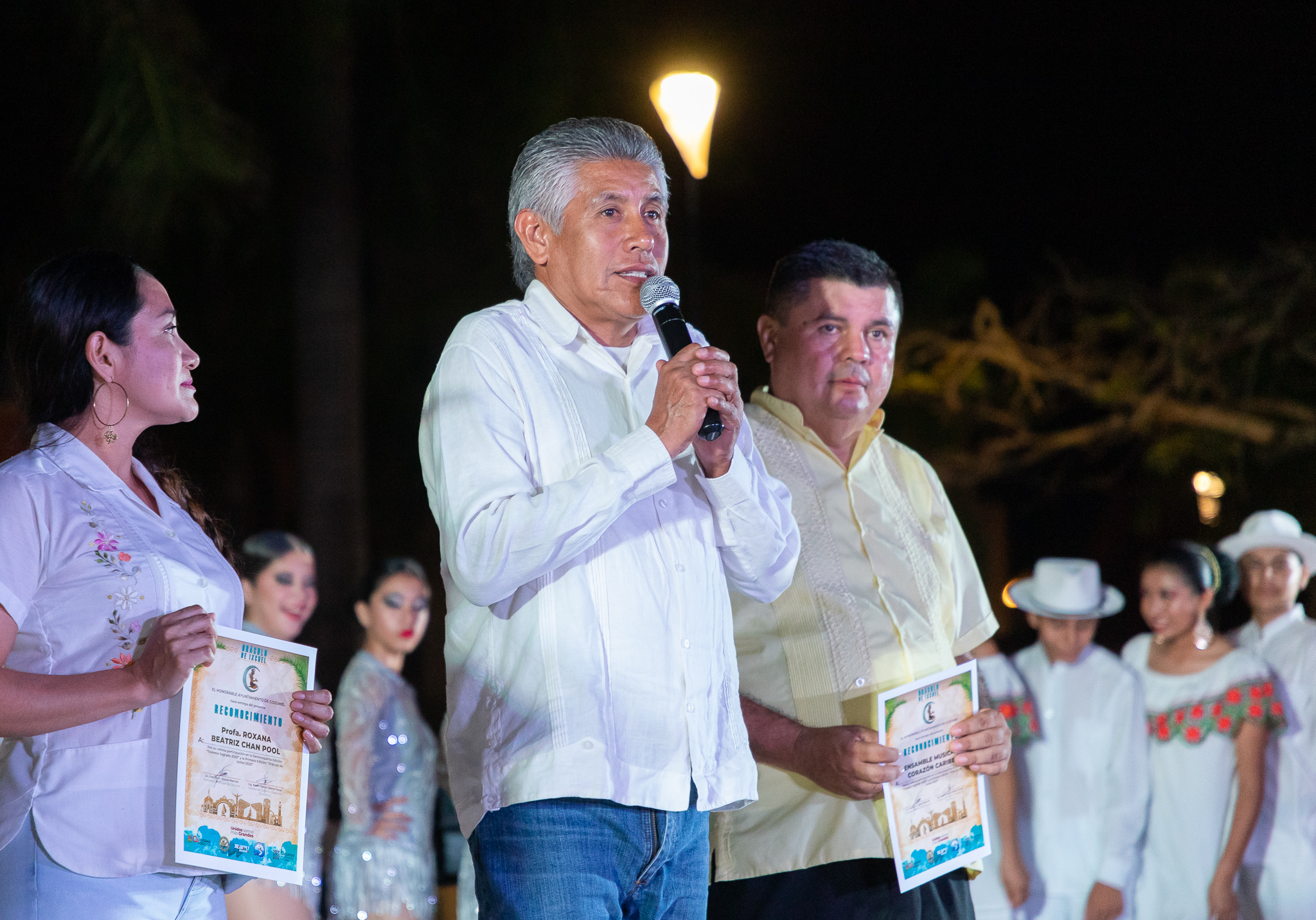 Ante el emblemático reloj público en el que se proyectaron imágenes de la diosa Ixchel y que fue disfrutada por cientos de turistas y público local que se dio cita en el parque Benito Juárez, y como parte del protocolo de clausura los funcionarios municipales mencionados acompañadas de la directora general de Desarrollo Social, Carmen Beatriz Moreno Ramírez hicieron entrega a Elena Noemí Ricalde Sansores, Janet Griselda Venegas López, Roxana Beatriz Chan Pool, así como al ensamble Corazón Caribe por su participación en este festival que fue llevado a cabo con la suma de voluntades.