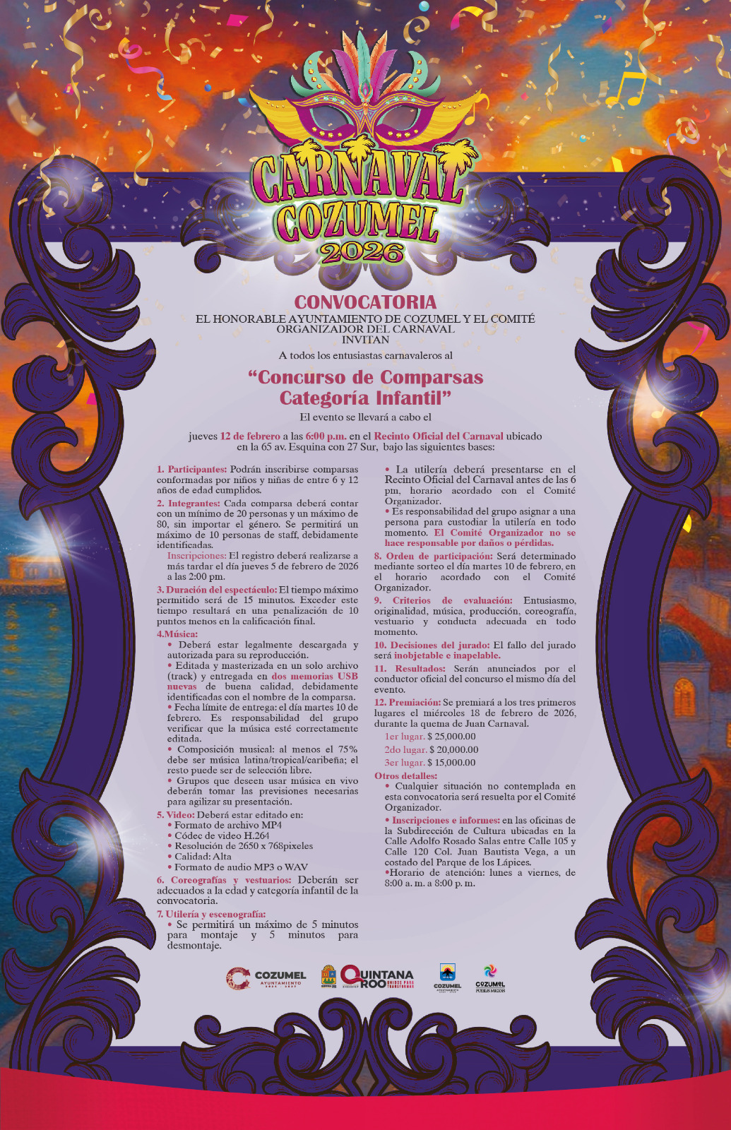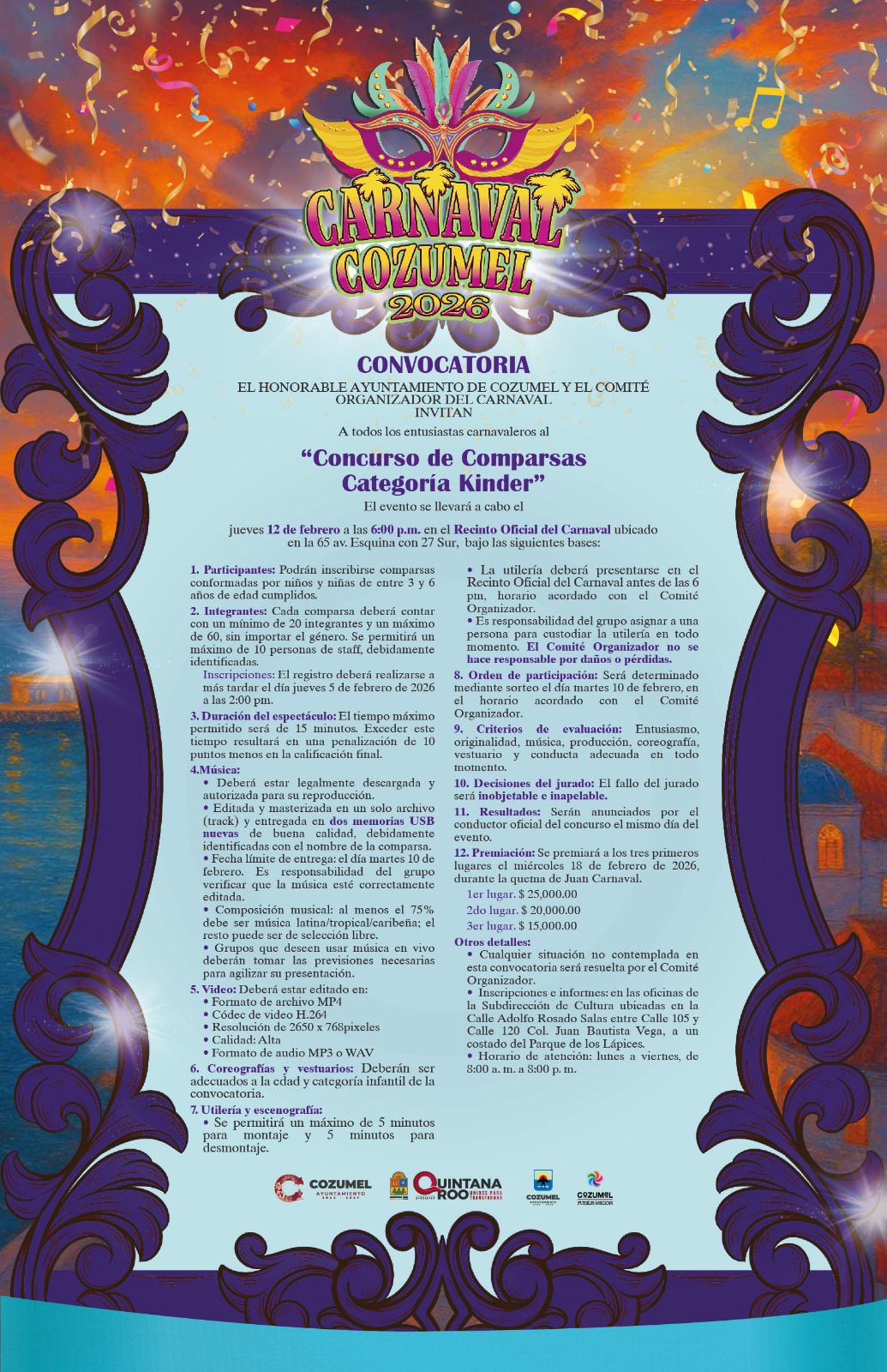 Para impulsar la participación infantil y preservar las tradiciones culturales de la Isla, el Comité Organizador del Carnaval convoca a todos los entusiastas carnavaleros a participar en los concursos de comparsas categorías “Kínder” e “Infantil” que se llevarán a cabo el 12 de febrero como parte de las actividades oficiales del Pre Carnaval Cozumel 2026.