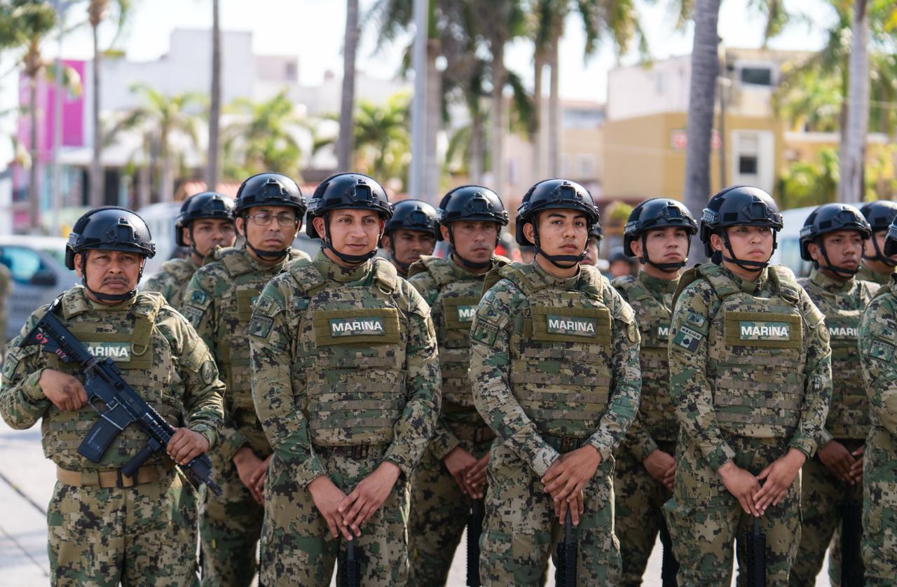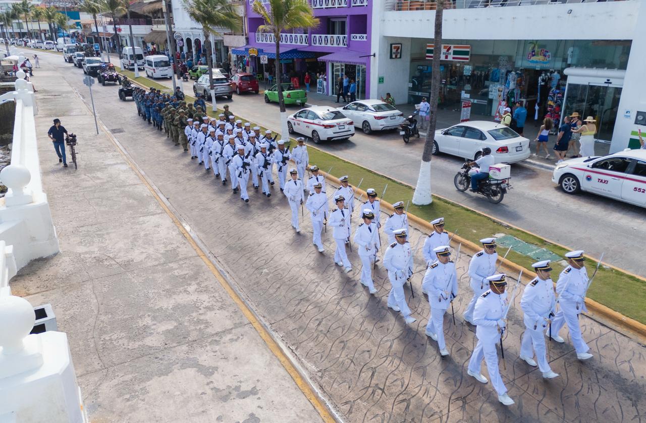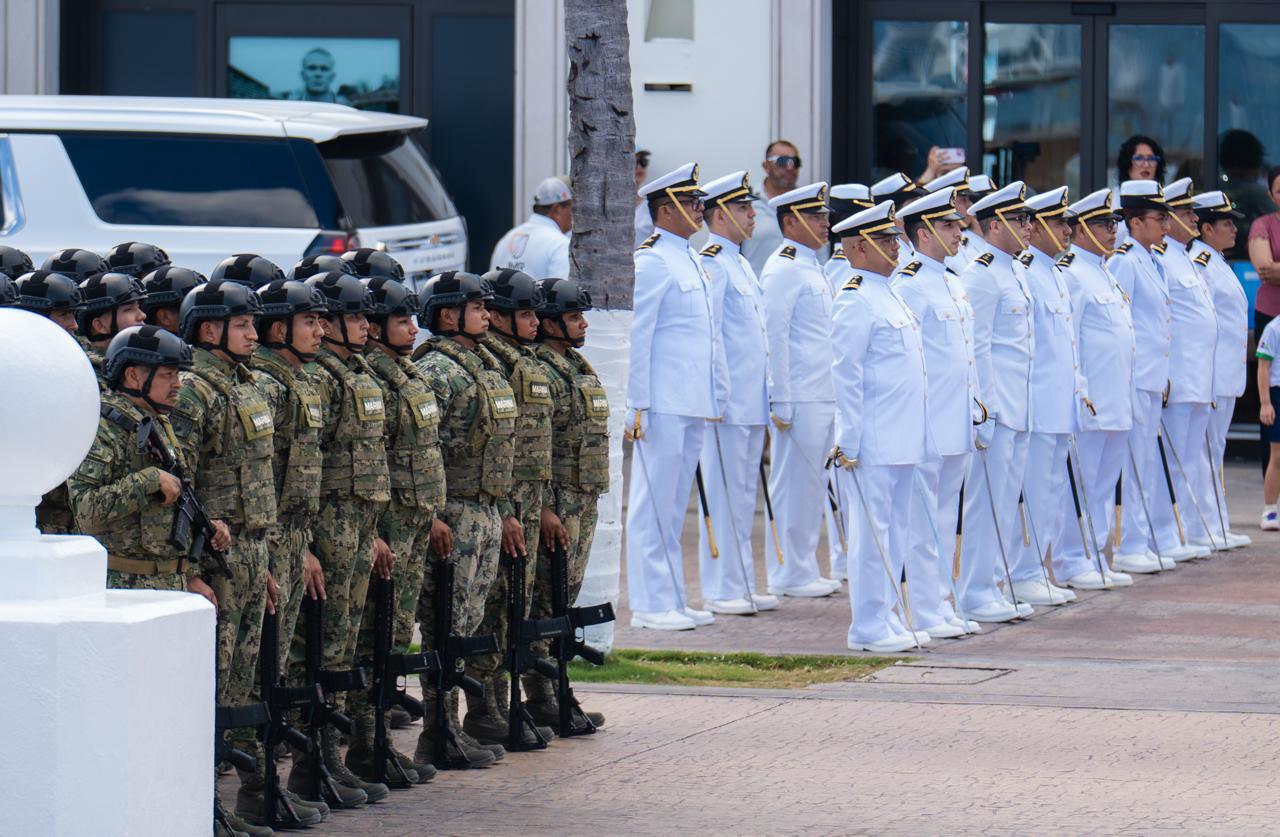 Como parte del protocolo, se realizó el desfile de la columna de honores sobre la avenida Rafael E. Melgar, con la participación del estandarte de la Secretaría de Marina, banda de guerra del Sector Naval, escolta de la zona aérea militar, sección de guías del Sector Naval, guarnición y zona naval, binomios caninos, sección de Infantería de Marina, oficiales, clases y marinería del Sector Naval, así como la Guardia Nacional, guarnición y base aérea.