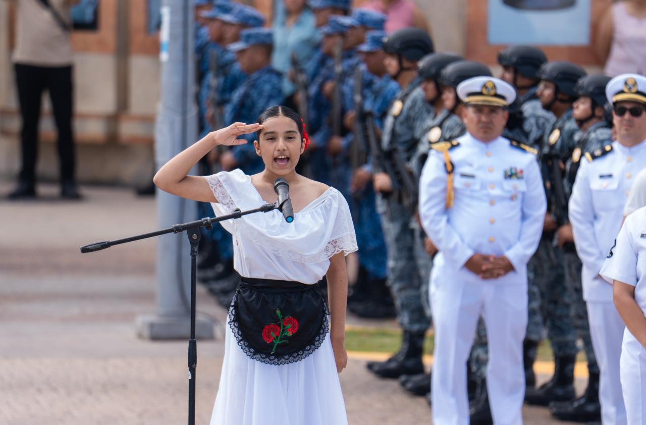 Durante la ceremonia, la niña Natalia Gutiérrez Sixtos, hija de un elemento naval, realizó la declamación de la poesía “21 de abril”, mientras que Óscar Antonio González Huerta efectuó el pase de lista de honor de los héroes de la Heroica Escuela Naval y del Heroico Colegio Militar, a quienes en su memoria se disparó una bala de salva de fusilería.