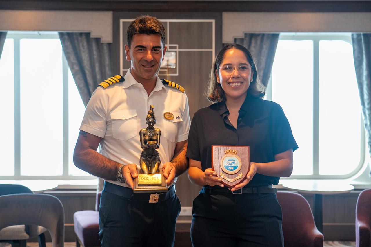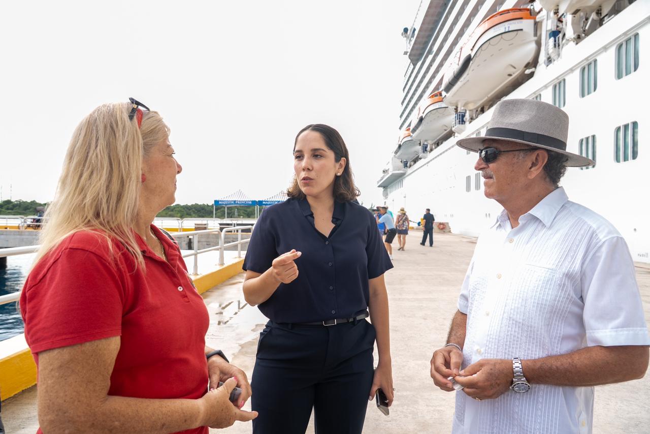 “Hoy Cozumel recibe al majestuoso Majestic Princess, un impresionante crucero que trae a miles de visitantes de todo el mundo”, destacó la segunda regidora del Ayuntamiento, María Fernández Vargas González, quien encabezó la comitiva de recepción, conformada por la síndico, Daniela Ayala Blanco y la oficial mayor, Azalea Morales Mejía, para el tradicional intercambio de placas con el capitán del crucero, Giussepe Castellano, en una cálida bienvenida desde el muelle SSA México.
