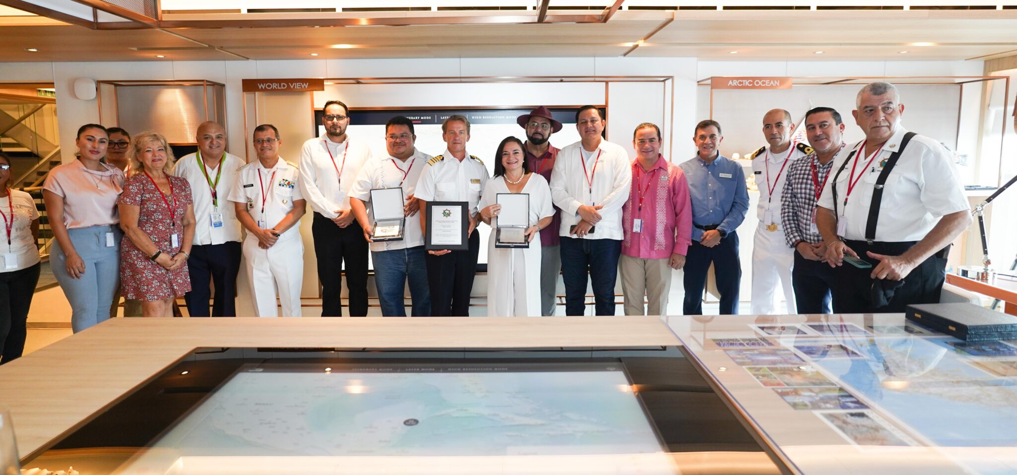 Como parte de esta visita, el consultor de ventas del crucero, Fernando Colado, ofreció un recorrido guiado a las autoridades entre las que también se encontraba el director general de la Fundación de Parques y Museos de Cozumel (FPMC), José Luis Chacón Méndez, en representación de la gobernadora del estado, Mara Lezama Espinosa; el director de Turismo y Desarrollo Económico, Badih Sleme Flores; el director de la Administración portuaria integral (APIQROO), Miguel Alonso Marrufo y el representante del Consejo de promoción turística en Cozumel, Pablo Aguilar Torres.