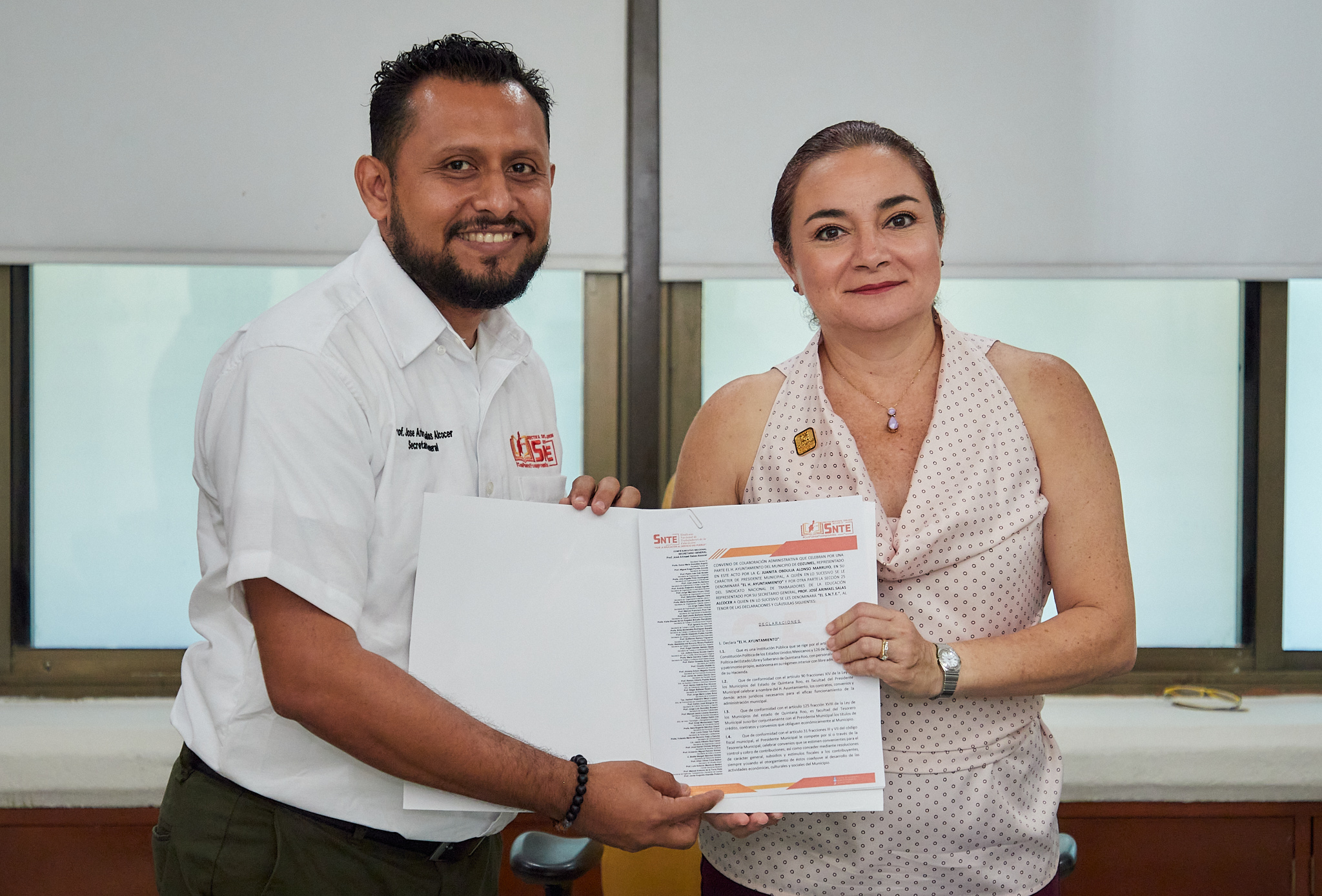 La presidenta municipal, Juanita Alonso Marrufo, sostuvo una reunión de trabajo con el nuevo secretario general de la sección 25 del Sindicato nacional de trabajadores de la educación (SNTE) de Quintana Roo, José Arimael Salas Alcocer, quien además de entregar un borrador para la signatura del convenio de colaboración entre ambas partes, felicitó a la munícipe por el trabajo realizado en favor de las escuelas de la isla.