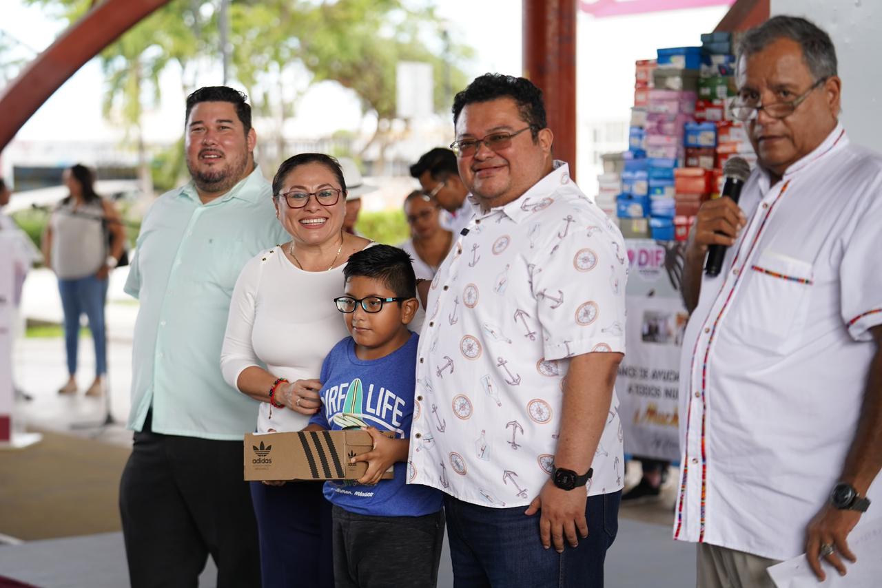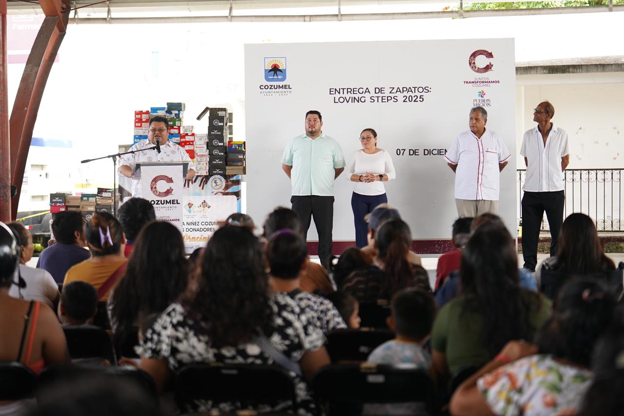 En una emotiva mañana bajo el domo del parque San Gervasio, el presidente municipal José Luis Chacón Méndez, acompañado de su esposa Diana Sosa Blanco, presidenta honoraria del DIF Cozumel; Félix Sebastián Solís Frías, director general del Sistema DIF Cozumel; Jeff Hanson, fundador de Loving Steps A.C.; y Fernando Segovia, presidente de la misma asociación, encabezaron la entrega anual de zapatos “Loving Steps 2025”, una iniciativa en la que empresarios y ciudadanía donaron 125 pares de zapatitos para niñas y niños cozumeleños.