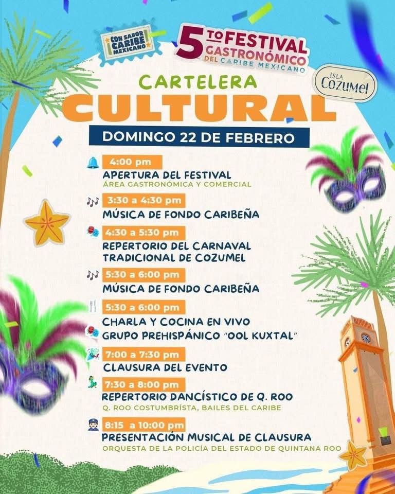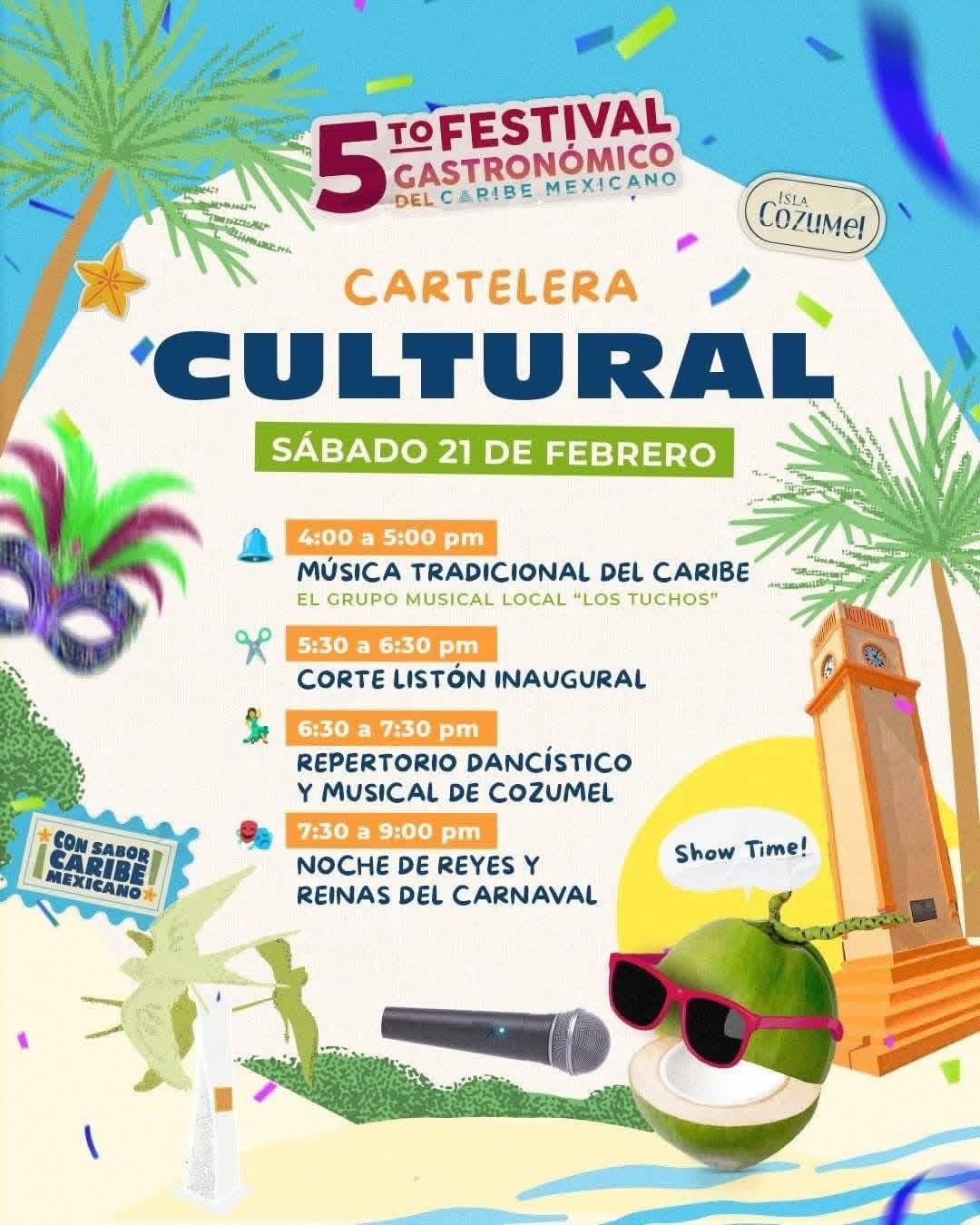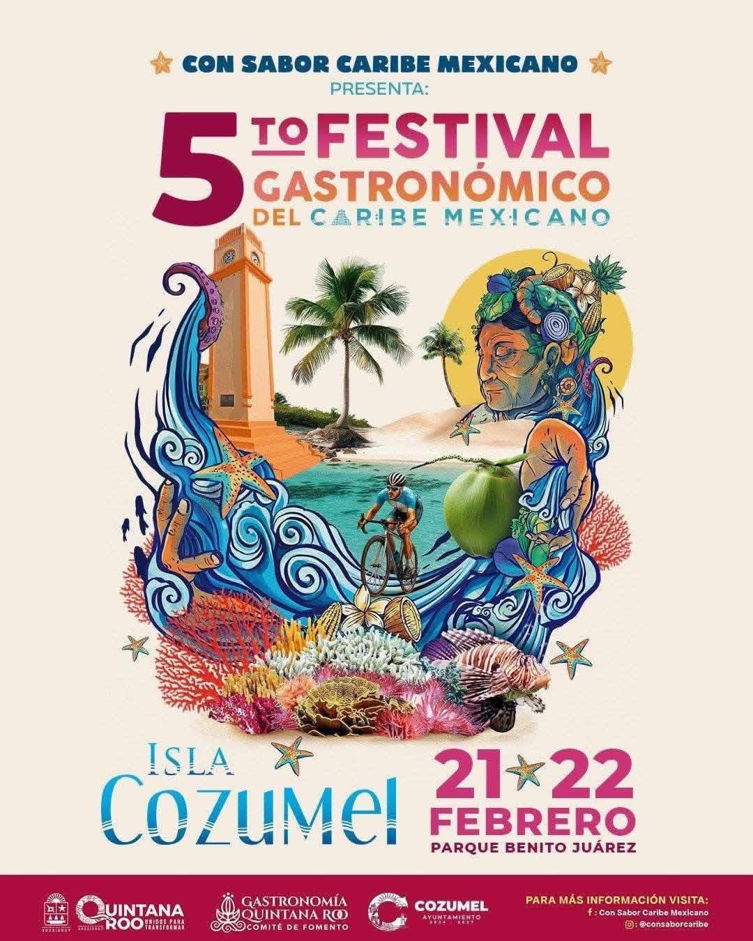 El Gobierno Municipal invita a la comunidad cozumeleña y a visitantes a disfrutar del 5to Festival Gastronómico del Caribe Mexicano, que se llevará a cabo los días 21 y 22 de febrero en el Parque Benito Juárez, en un horario de 4:00 de la tarde a 10:00 de la noche.