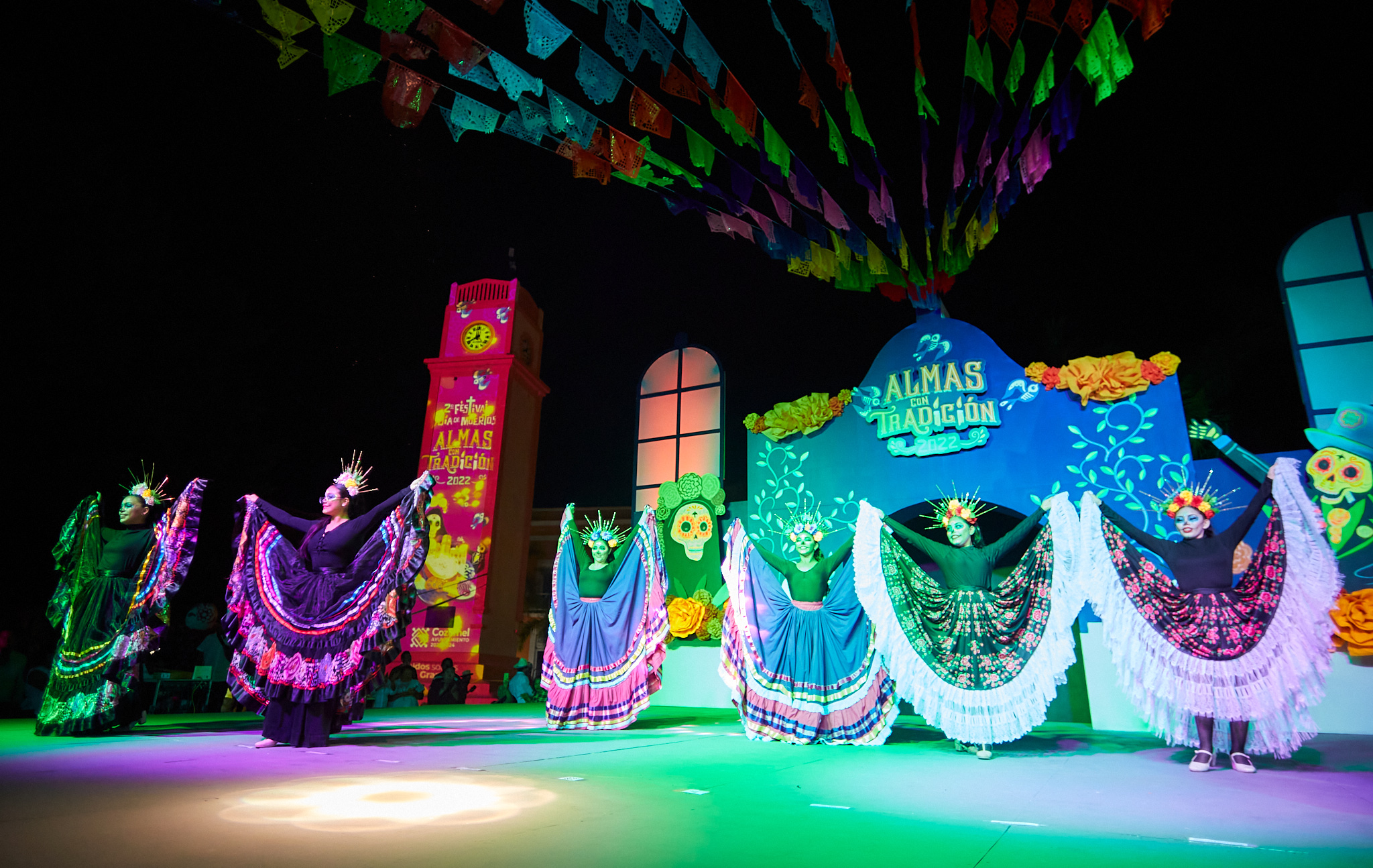 Inicia con gran éxito el segundo Festival de Día de Muertos “Almas con Tradición 2022” con duración del 28 de octubre del 2 de noviembre, el cual fue inaugurado por la presidenta municipal, Juanita Alonso Marrufo ante cientos de cozumeleños y turistas que se dieron cita en el parque Benito Juárez, luego del esperado desfile de las ánimas que inició desde el panteón San Miguel.
