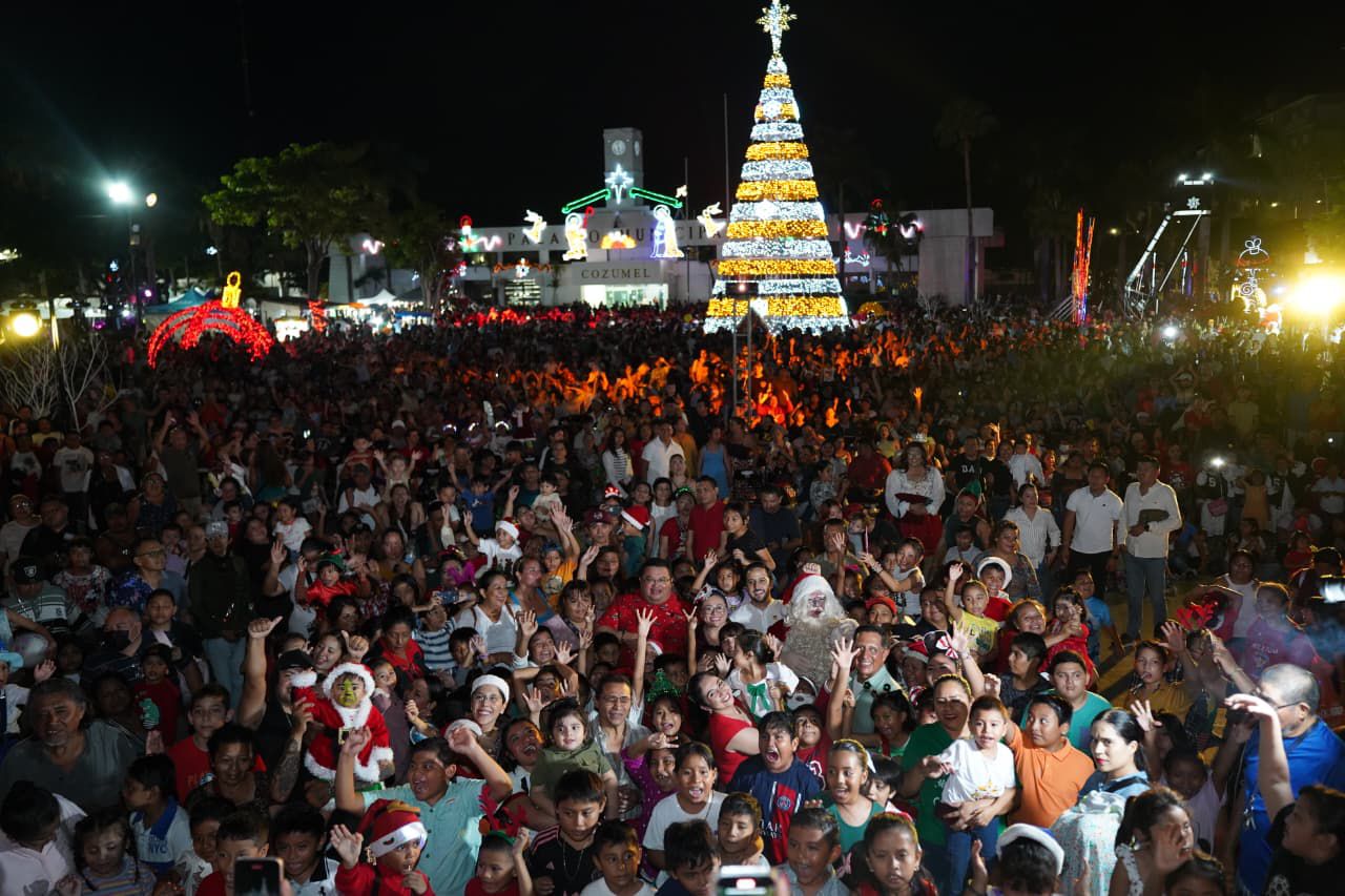 El segundo festival navideño “Mar de estrellas” dio inicio con el brillante encendido de luces del árbol y del parque Quintana Roo, donde un majestuoso escenario en tonos rojos, dorados y verdes, acompañado de enormes cajas de regalo y la villa de la Navidad, creó un ambiente mágico que invitó a las familias a capturar las mejores postales de recuerdo. Entre música, color y espíritu decembrino, Cozumel vivió una noche llena de tradición y alegría.