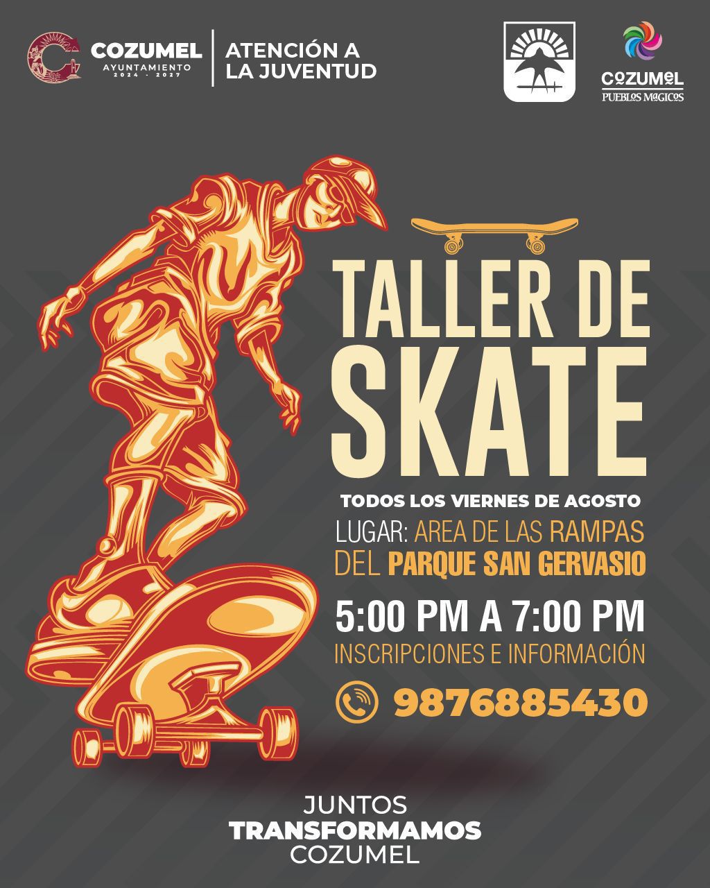 En el marco del Mes de la Juventud 2025, el gobierno municipal de Cozumel, que preside José Luis Chacón Méndez a través de la subdirección de Atención a la Juventud, dio inicio al “Taller de Skate”, en el Parque San Gervasio, el cual será sede del impulso al talento joven sobre ruedas. Una actividad gratuita que busca promover el deporte urbano y ofrecer espacios de expresión y desarrollo para las y los jóvenes de la isla.