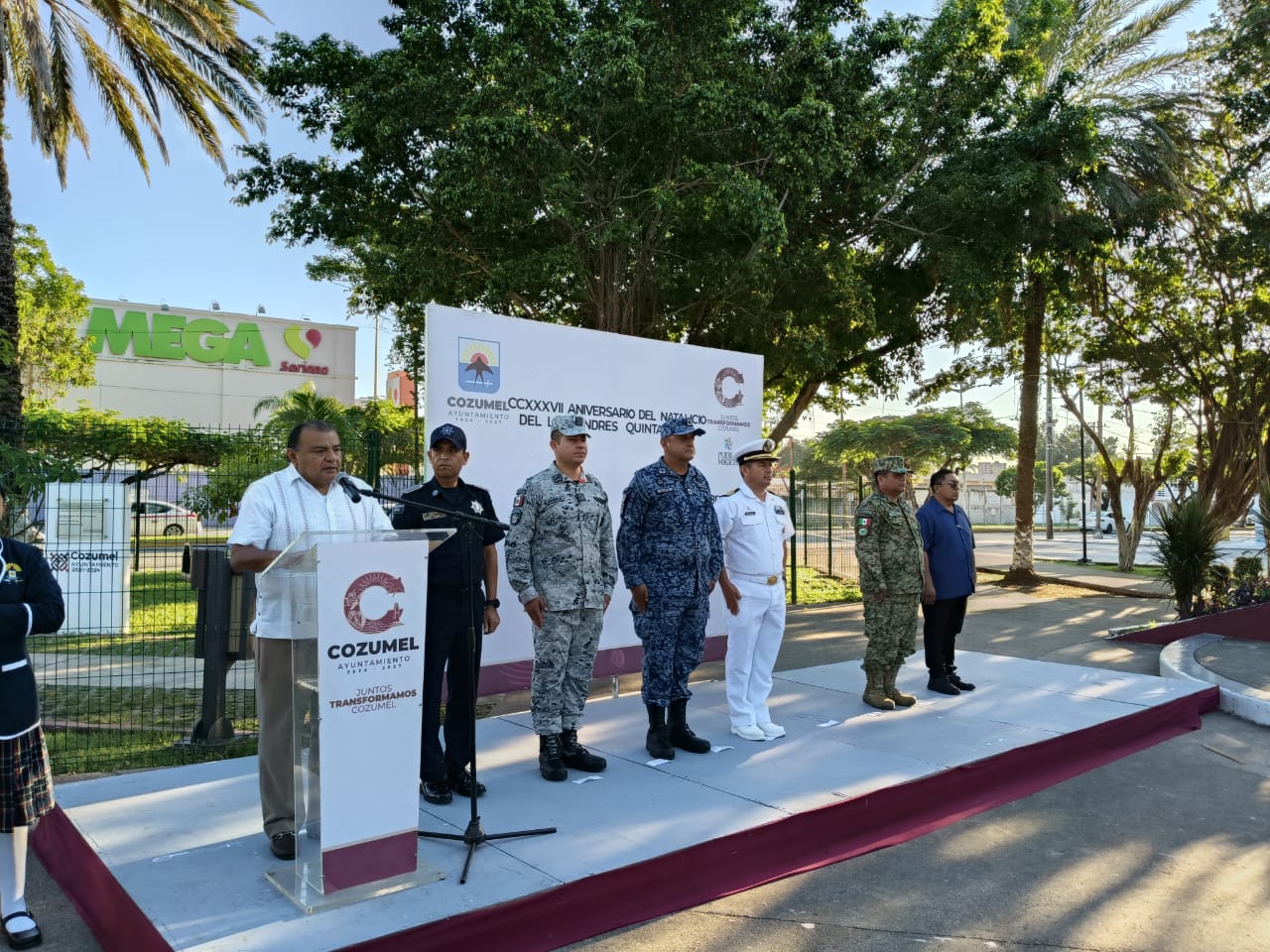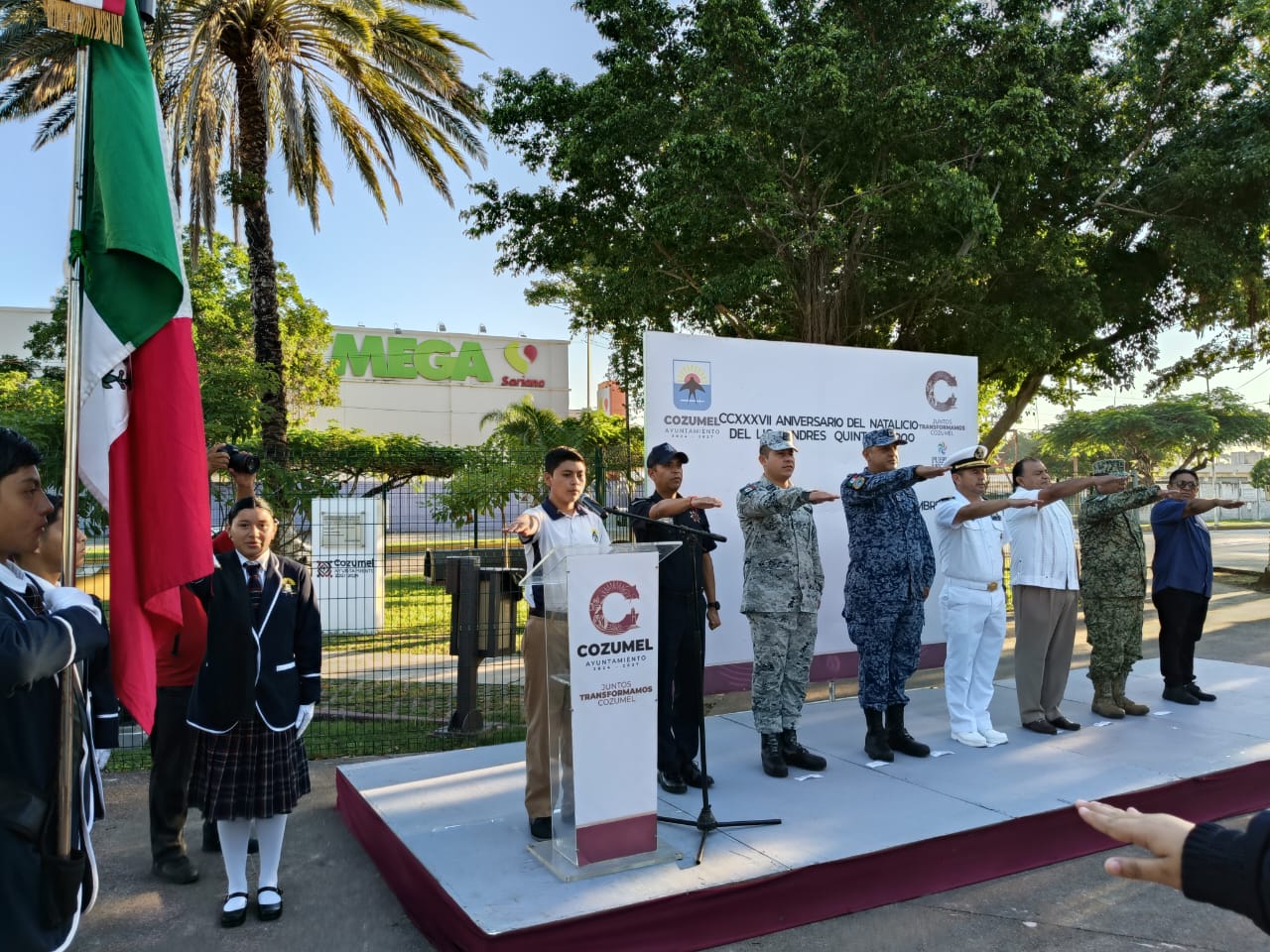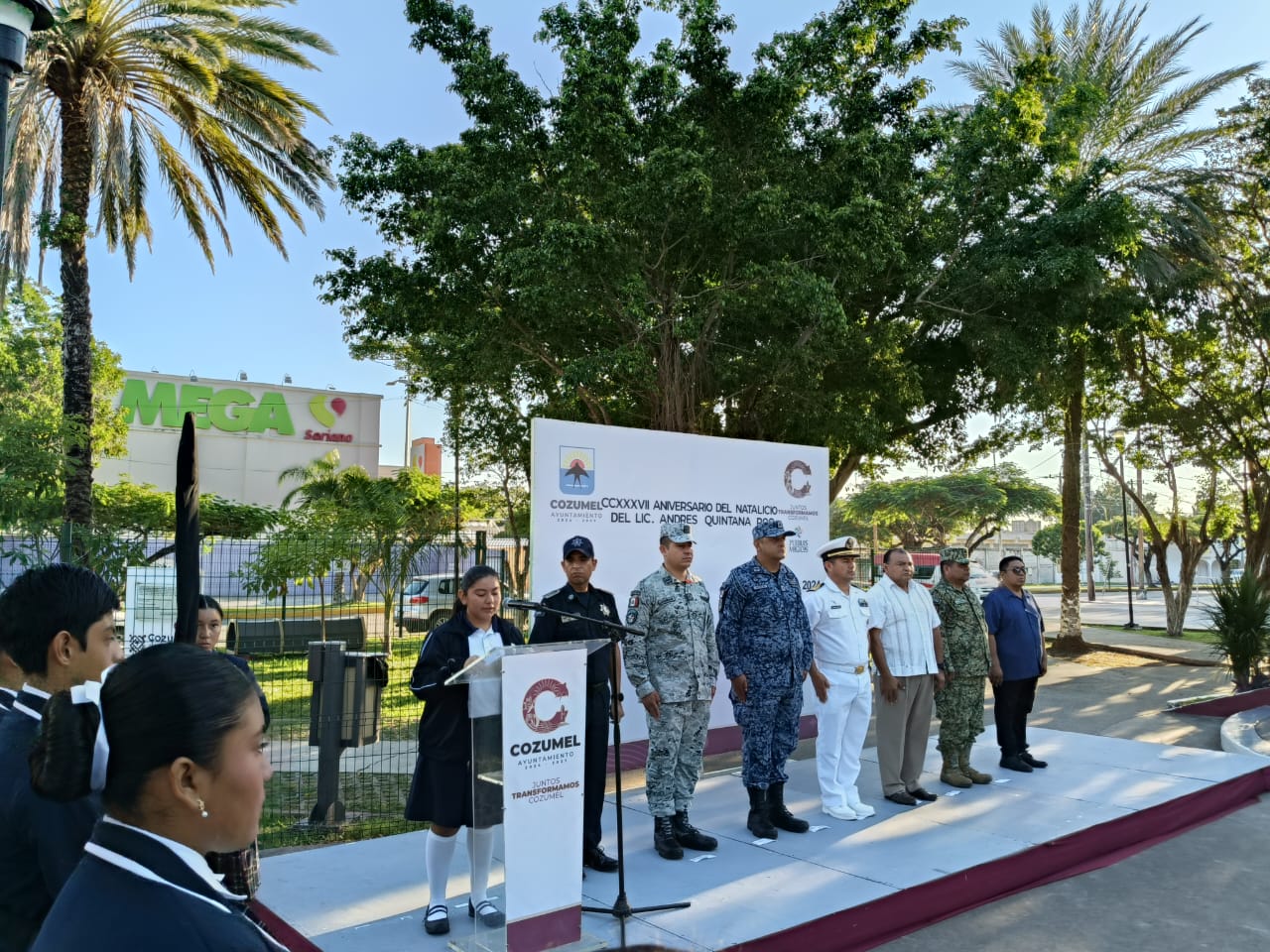El evento, realizado en la plaza del parque Quintana Roo, comenzó con el solemne juramento a la bandera a cargo del alumno Erick Alonso Cruz, para luego dar paso a las palabras oficiales, a cargo del tesorero municipal del Ayuntamiento, Javier Ricardo Villanueva Catzin, quien en representación del Edil, recordó la importancia del legado de don Andrés Quintana Roo para la historia de México y su vinculación con la identidad y el progreso de Cozumel.