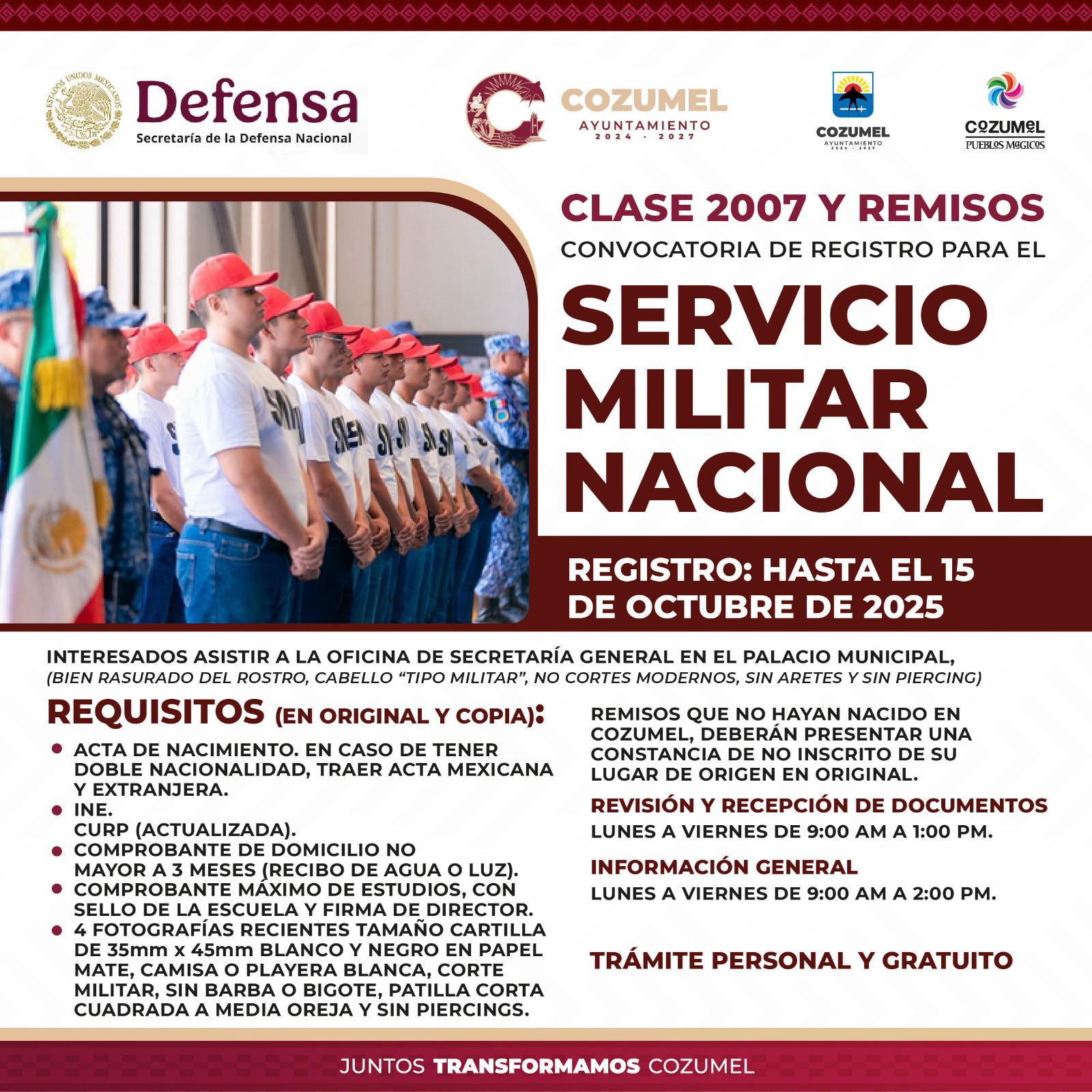 A fin de cumplir con su deber cívico y fortalecer los valores de responsabilidad, disciplina y amor por México, el Gobierno municipal que encabeza José Luis Chacón Méndez en coordinación con la Secretaría de la defensa nacional, invitó a los ciudadanos de la Clase 2007 y remisos para aprovechar los últimos días del periodo de registro para realizar el Servicio Militar Nacional (SMN) durante el año 2026 en la Base Aérea Militar.