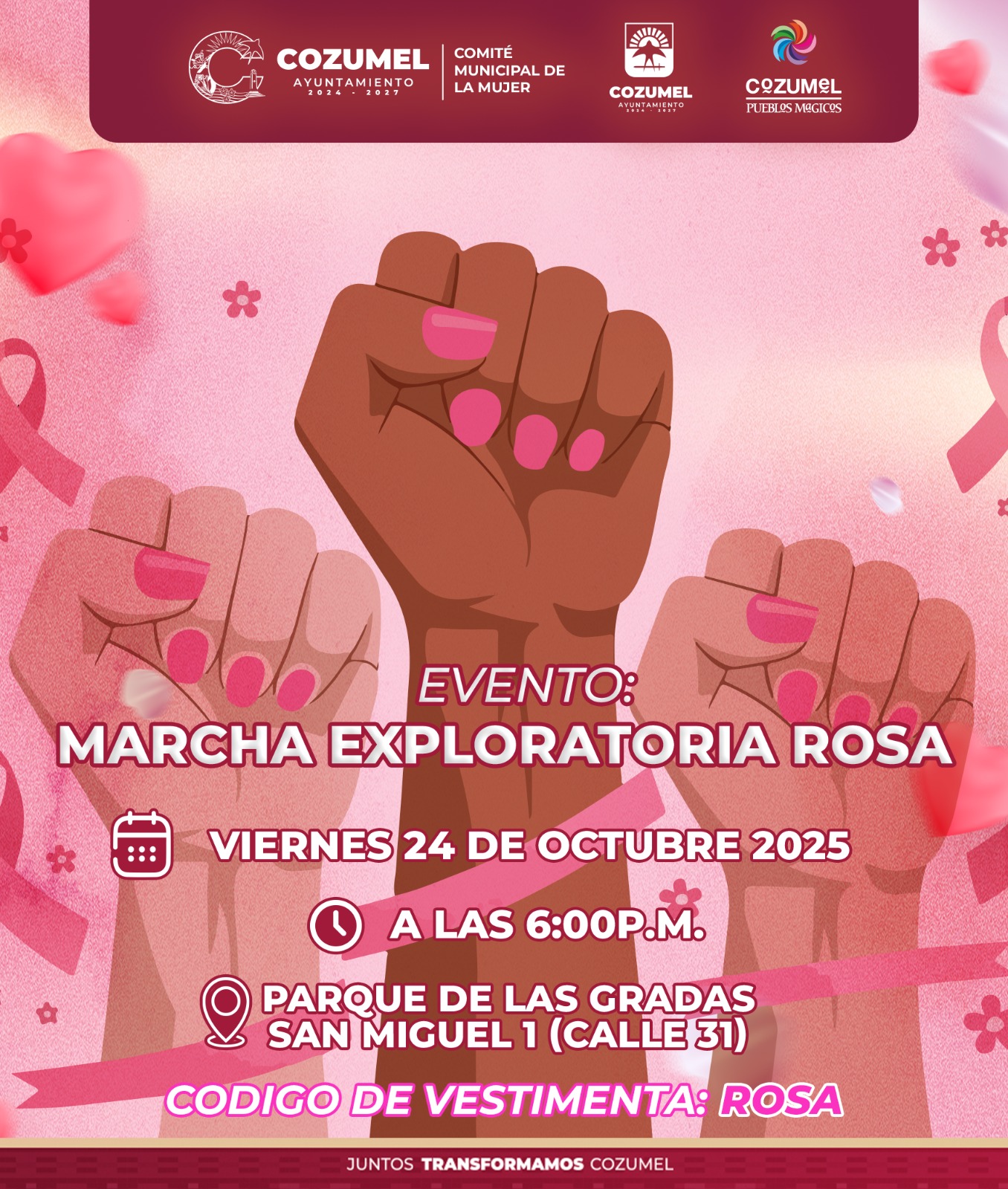 Durante todo el mes, el Comité Municipal de la Mujer reafirma su compromiso con las mujeres cozumeleñas, impulsando acciones que promueven la salud, la prevención y la unión comunitaria, se recomienda vestir de color rosa para asistir a los eventos.