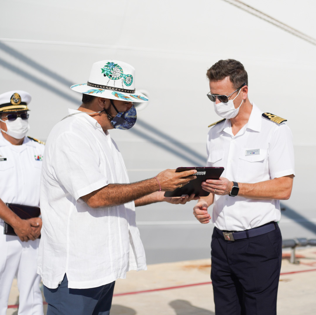 En este evento el titular de turismo, Badih Sleme, a nombre de la munícipe y de la comunidad cozumeleña le dio la bienvenida al capitán del navío turístico, Alessandro Zanello y al director de hotel Stephen Crimes, a quienes les expuso su gratitud por elegir al puerto de Cozumel como parte de su ruta por los diferentes puertos del continente americano para el deleite de sus pasajeros, por lo que extendió la invitación para continúen incorporando a la isla entre su itinerario.