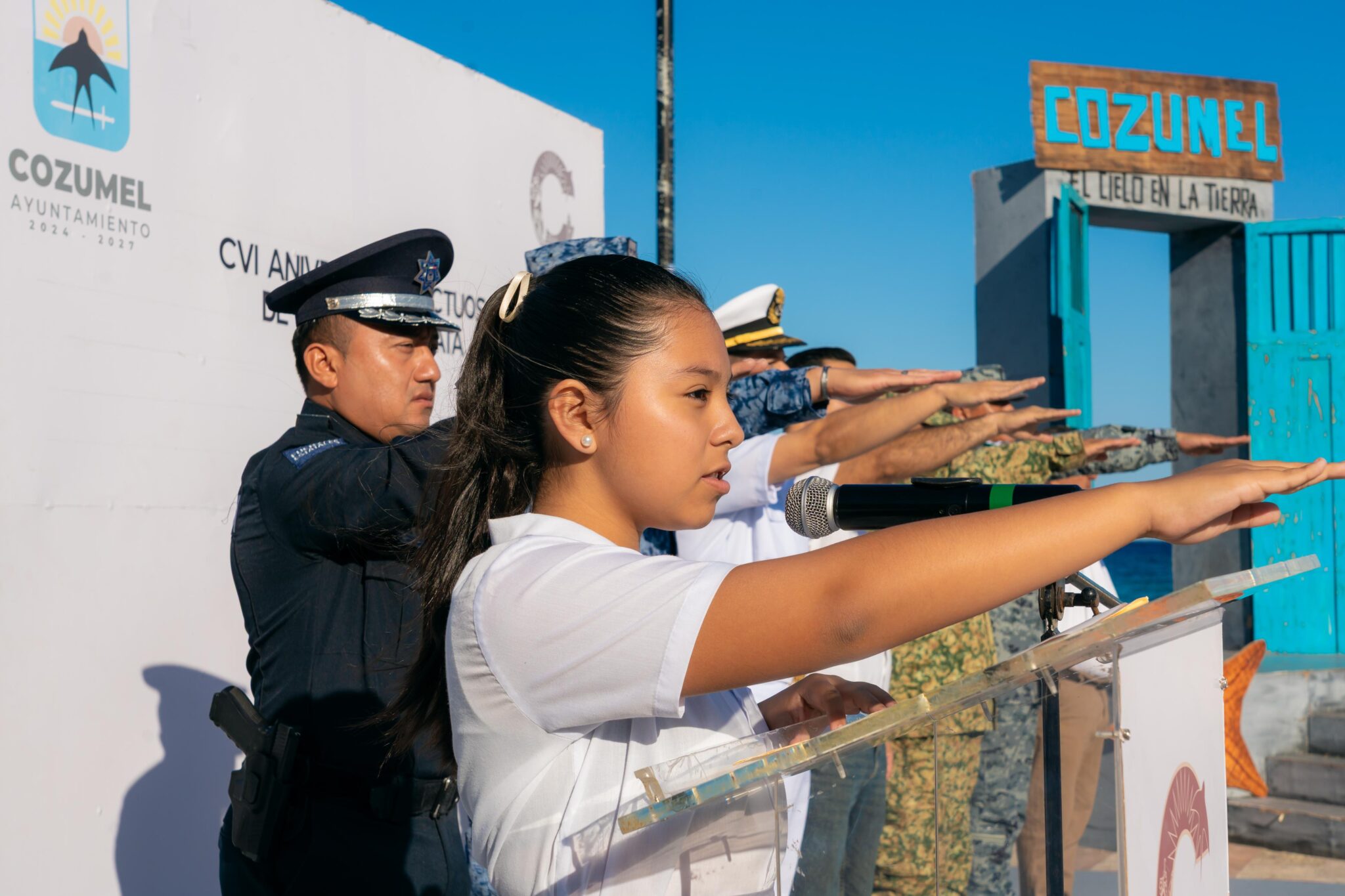 Como parte de este evento al que asistieron los representantes de las fuerzas armadas y estudiantes de primaria, la alumna Graciela Itzayana Chacón Dzul, de la escuela Federico Froebel, realizó el juramento a la bandera, y al término del acto protocolario fue colocada una ofrenda floral en la base del asta bandera en honor al líder revolucionario que luchó por la paz social e igualdad en nuestro país.