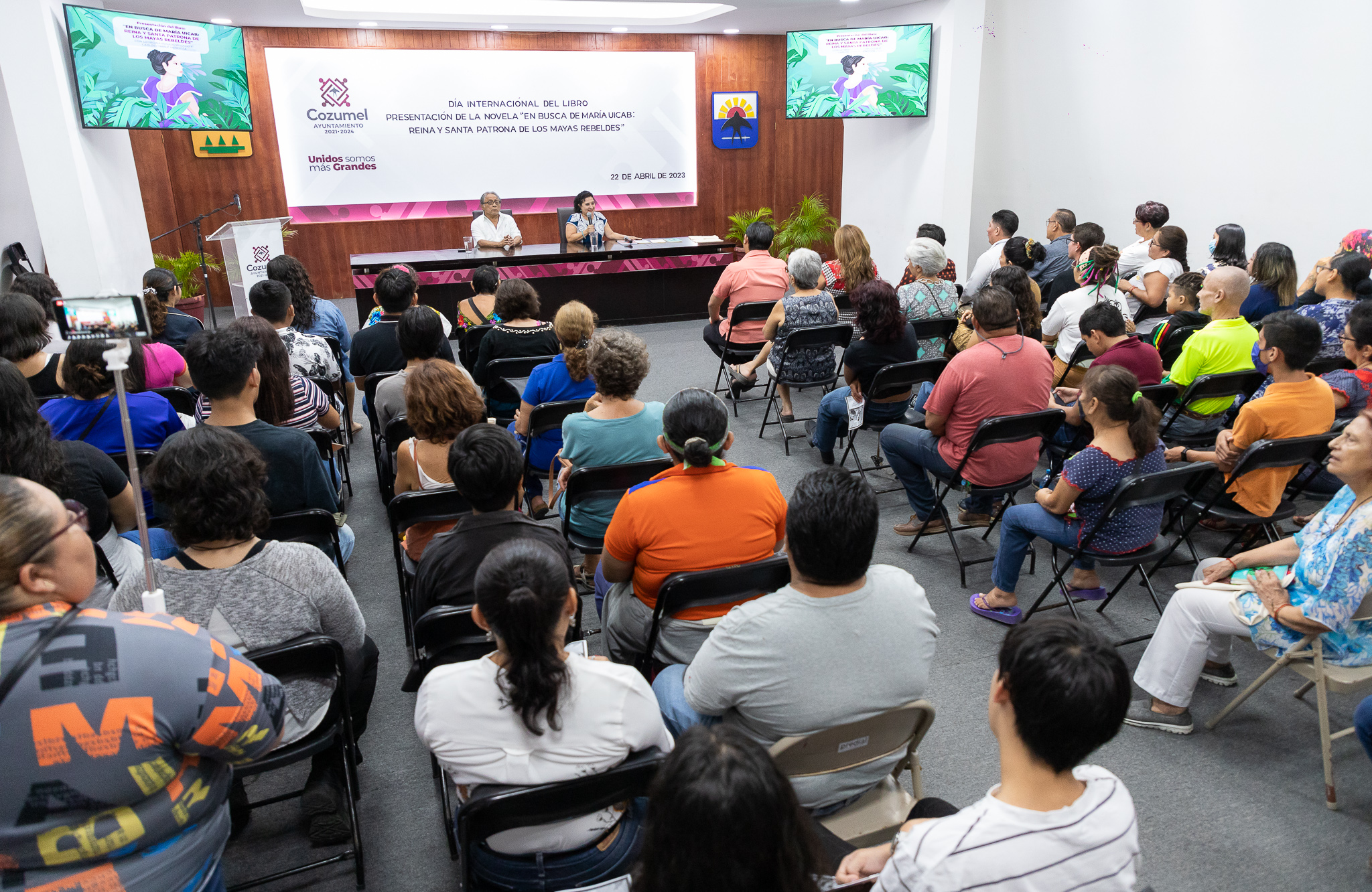 En el marco del Día Internacional del Libro, que se conmemora cada 23 de abril, en el salón Municipios de Quintana Roo con un lleno total, llevó a cabo la presentación del libro En busca de María Uicab, reina y santa patrona de los mayas rebeldes”, donde la primera regidora Ángela del Socorro Carrillo Chulin en representación de la presidenta municipal, Juanita Alonso Marrufo dio la bienvenida al público asistente.