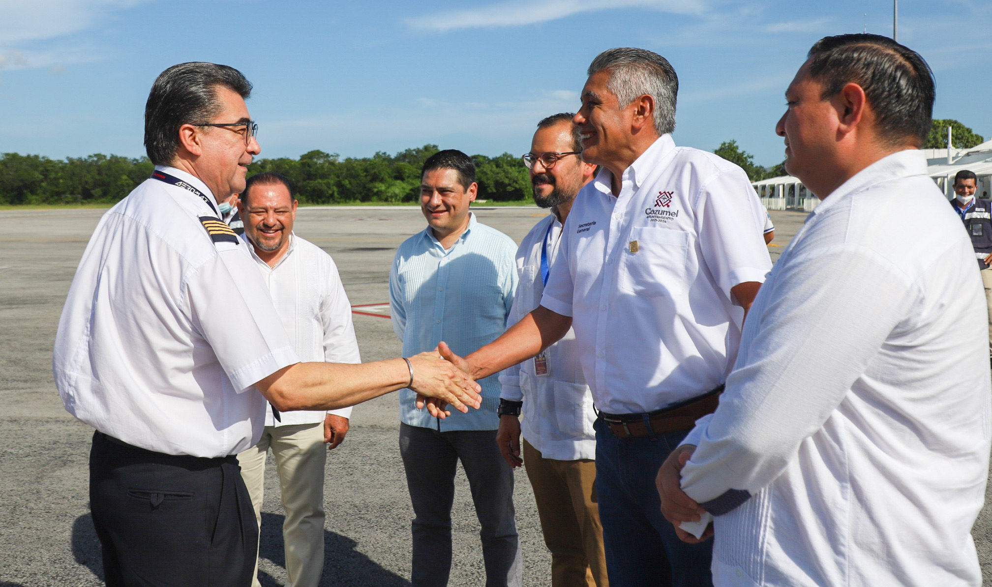 Luego de realizarse el acostumbrado “arco de agua” a la aeronave, el secretario general, Ociel González González, a nombre de la presidenta municipal, Juanita Alonso Marrufo, encabezó la bienvenida al capitán Fabricio Mendoza Oropeza y al primer oficial copiloto, Israel Marroquín Vélez, a quienes agradeció por brindar este servicio que aportará a la normalización económica del destino.