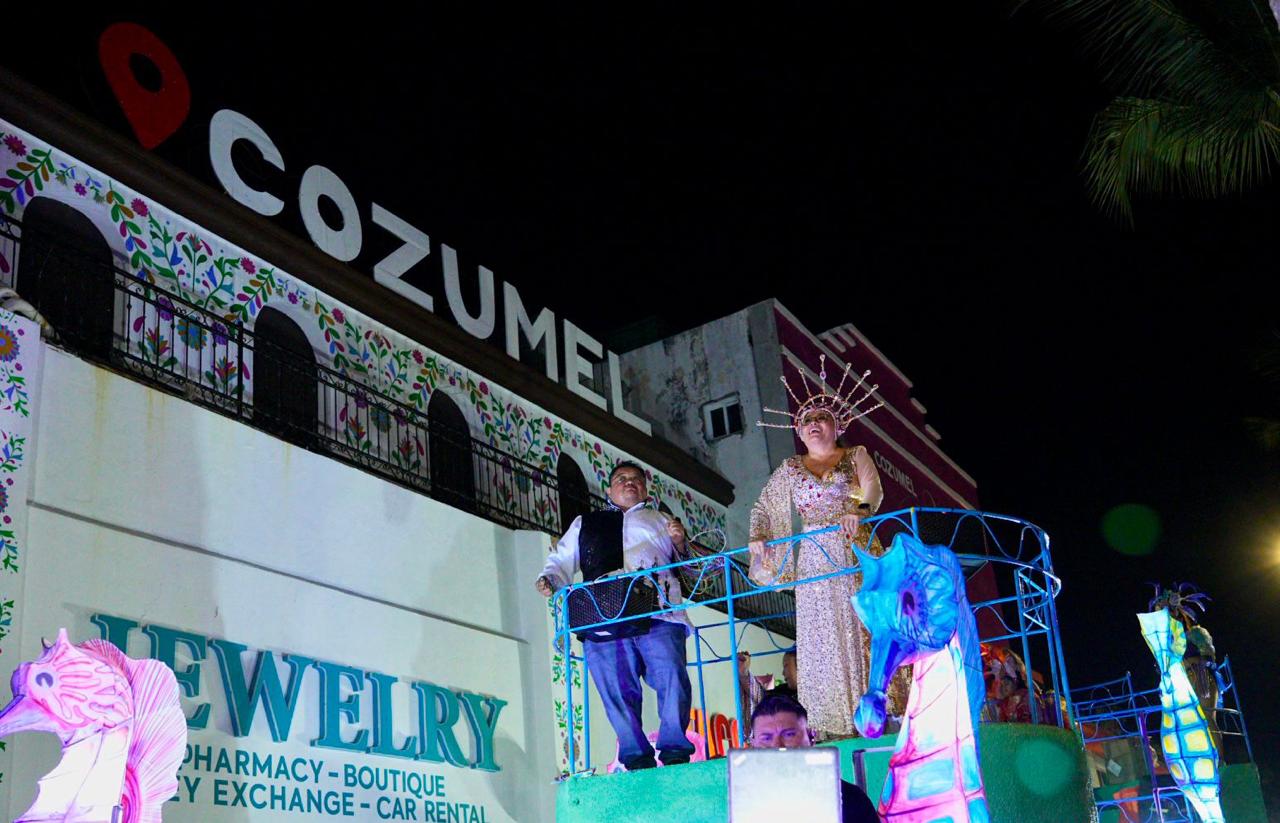 Historia, tradición y diversión se fusionaron en el inicio del Primer Gran Paseo de Carros Alegóricos del Carnaval Cozumel 2026, una celebración que conmemora 152 años de fiesta y orgullo isleño. El desfile, considerado uno de los más espectaculares del Caribe mexicano, fue encabezado por el presidente municipal, José Luis Chacón Méndez, quien lució un traje inspirado en el ajedrez, acompañado de su esposa, Diana Sosa Blanco, su reina, quien deslumbró con un majestuoso vestido en tonos dorados, contagiando alegría y entusiasmo a las miles de familias y visitantes que se congregaron a lo largo del recorrido.