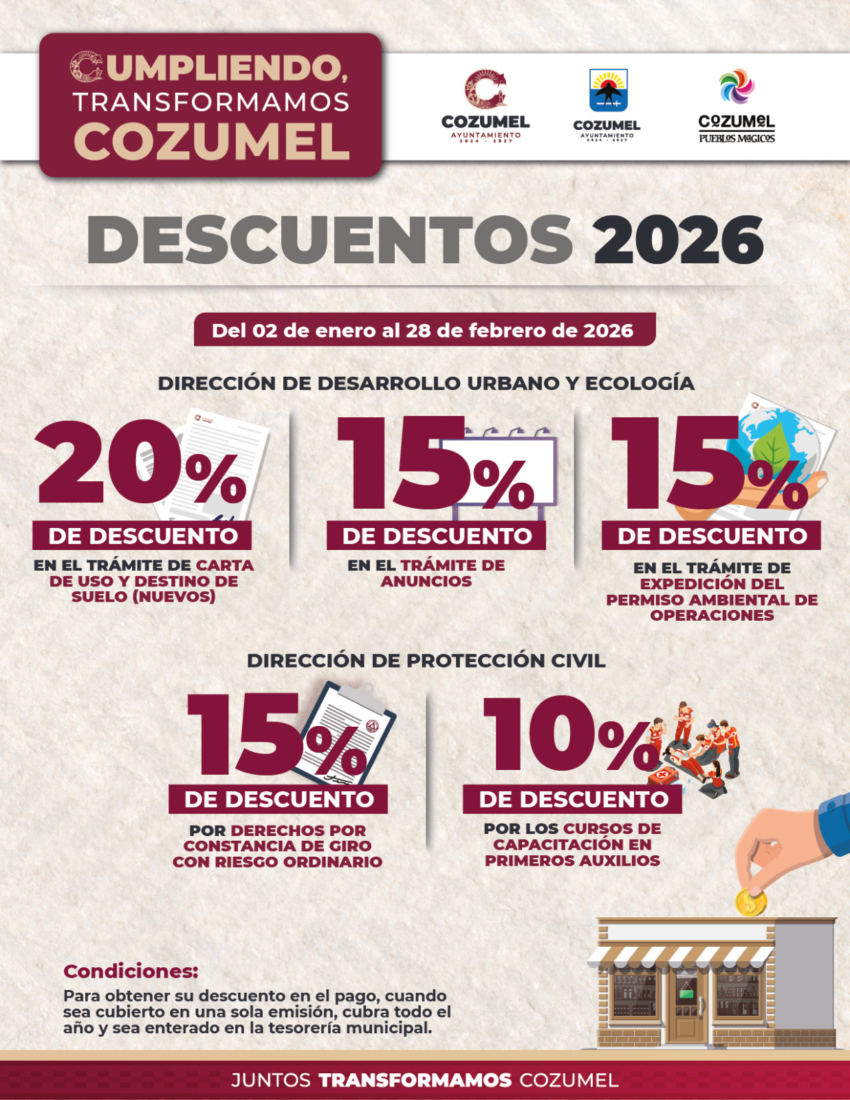 “Cumpliendo Transformamos Cozumel” contempla en la primera fecha, del 2 al 21 de enero el 15 por ciento de descuento en el pago en una sola exhibición del Impuesto Predial y del 2 de enero al 28 de febrero el 10 por ciento de descuento en el pago por el servicio de recoja de basura en casa habitación y local comercial, así como también el 20 por cuento de descuento a inscritos en el convenio “Blindaje Cozumel” avalados por Seguridad Pública y/o la Secretaría de Seguridad Ciudad.