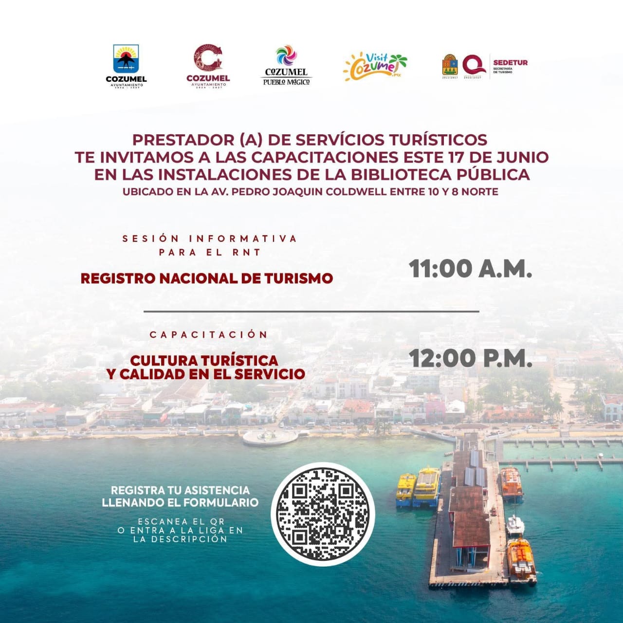 El Gobierno Municipal en coordinación con la Secretaría de Turismo del Estado de Quintana Roo convocan a todos los prestadores de servicios turísticos de Cozumel para aprovechar la capacitación gratuita enfocada en la cultura turística, calidad en el servicio y el Registro Nacional de Turismo (RNT).