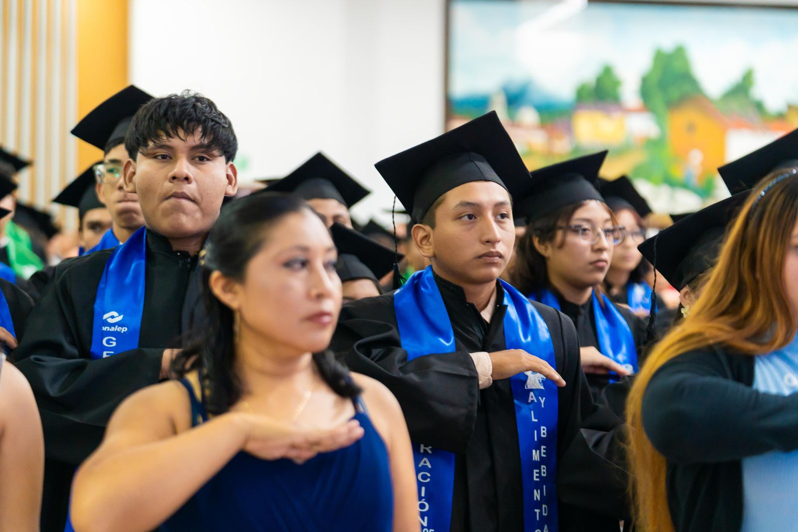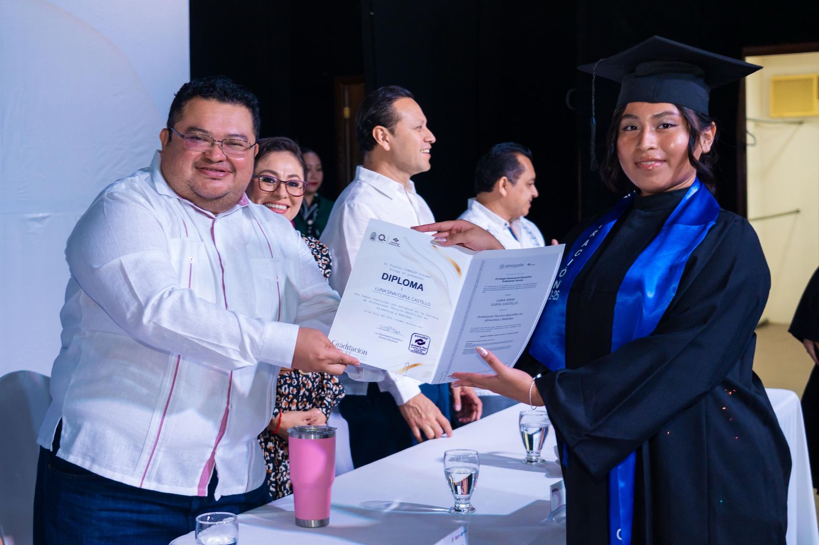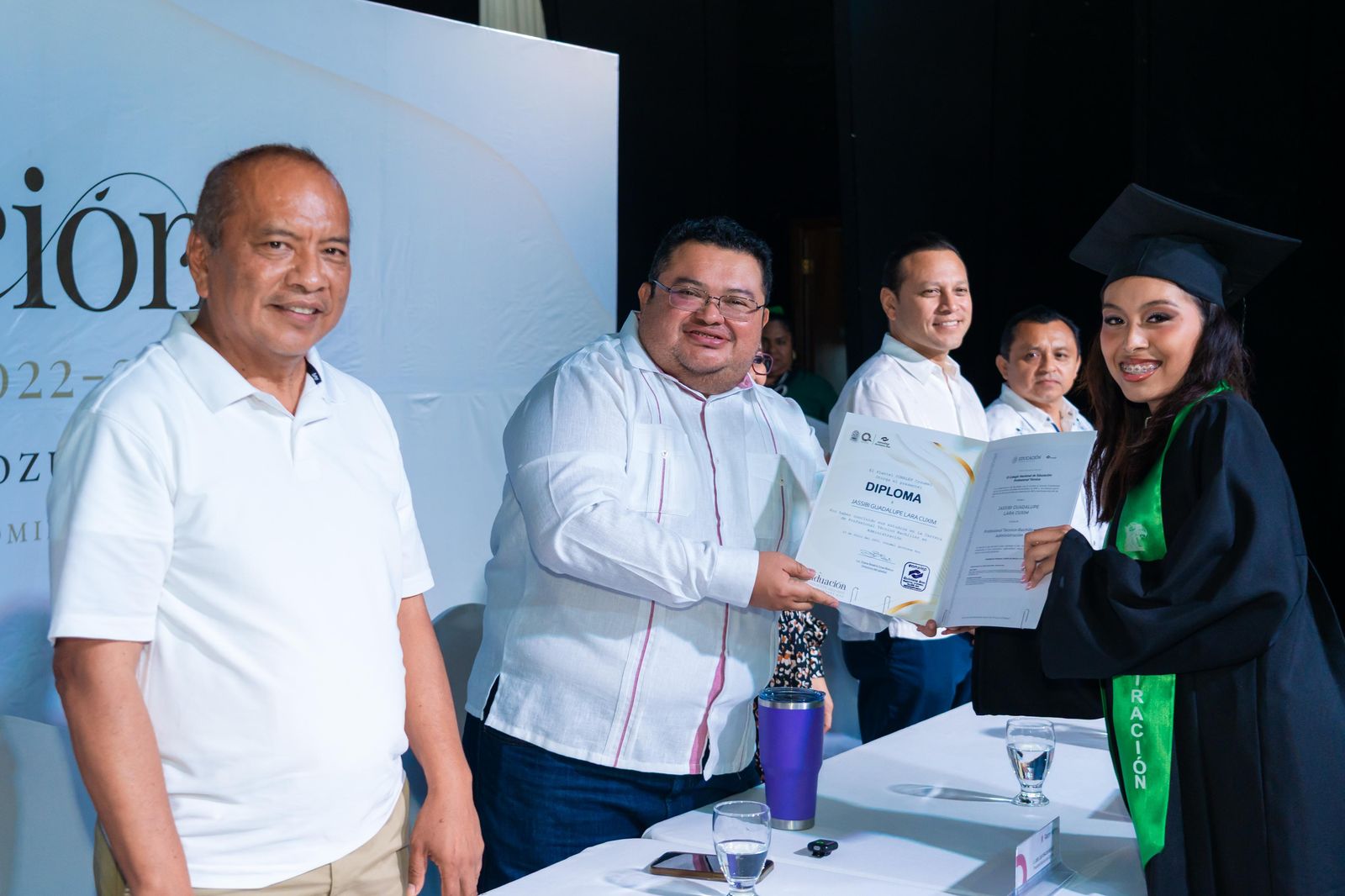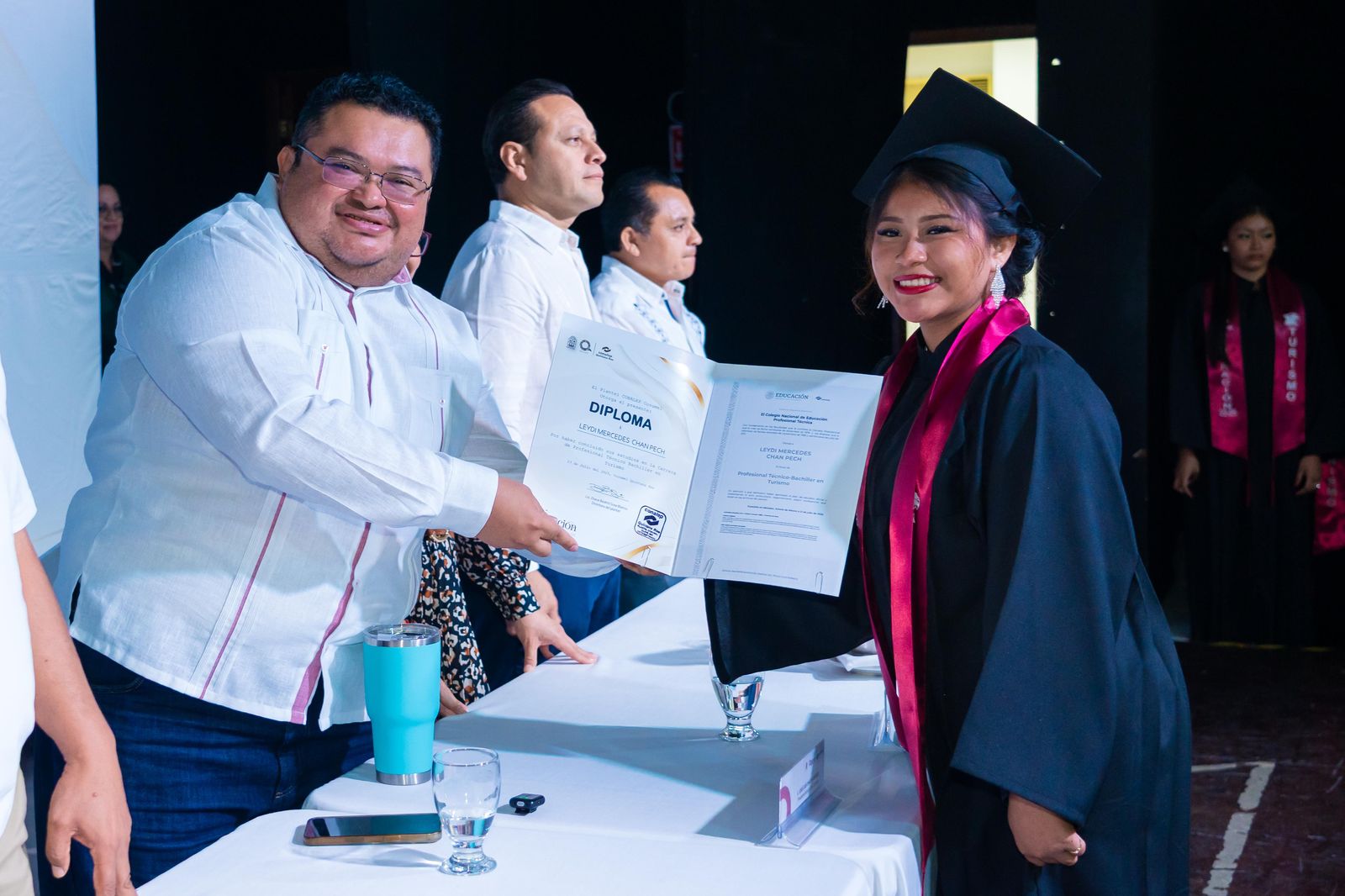 Durante la ceremonia se realizó el último pase de lista a cargo de los profesores y se entregaron certificados a los alumnos de las especialidades de Alimentos y Bebidas, Administración y Turismo, así como diplomas a quienes participaron en el sistema de Educación Dual. Asimismo, se otorgaron menciones honoríficas y un reconocimiento especial a la alumna Esmeralda Guadalupe Silva Celis, quien obtuvo excelencia académica con promedio perfecto de 10.