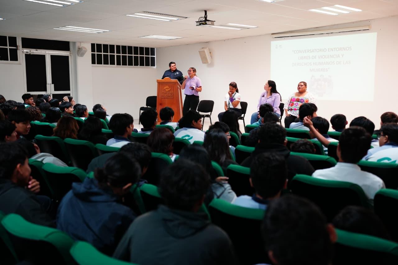En el marco del Día Internacional de la Mujer y de las actividades conmemorativas del mes de marzo, el gobierno municipal que encabeza José Luis Chacón Méndez llevó a cabo el conversatorio “Entornos libres de violencia y derechos humanos de las mujeres” en las instalaciones del CONALEP, con la participación de estudiantes y autoridades.