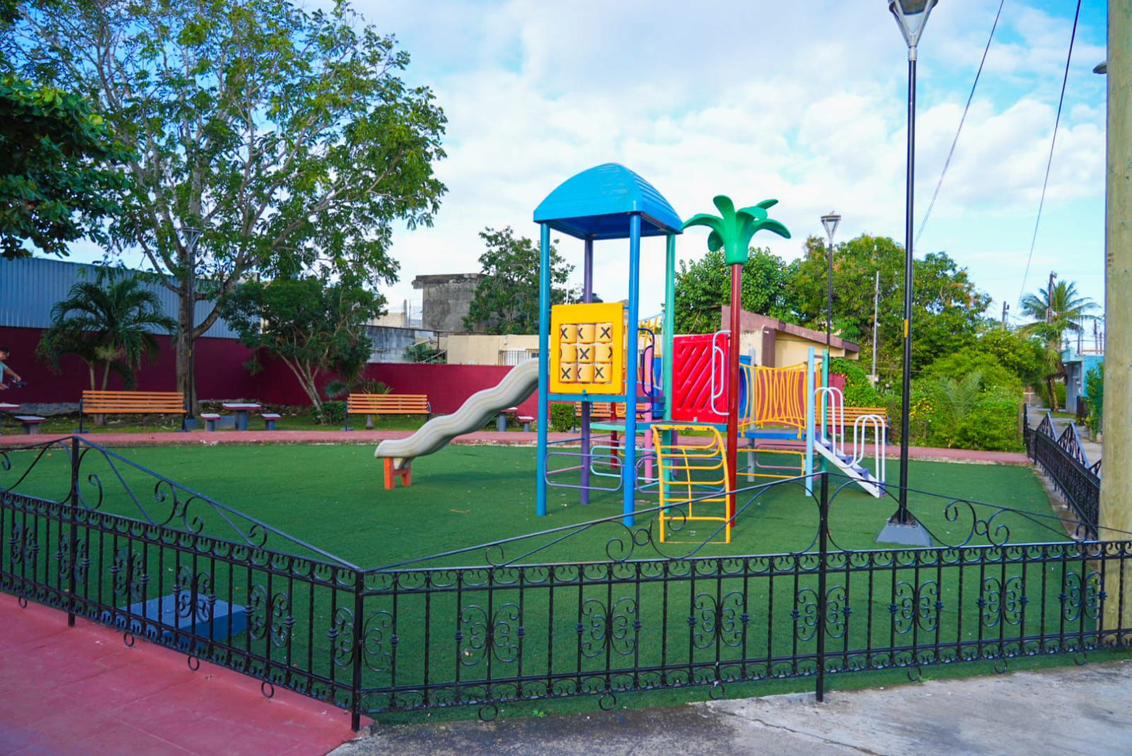 El director de Servicios Públicos, Héctor Martínez Ramírez, explicó que para esta obra de rehabilitación se pintó el piso en color terracota, se cambiaron las luminarias, se cambió todo el pasto sintético del área de juegos, se instalaron rejas en toda la zona infantil, se rehabilitaron las mesas y sillas de picnic y se dio mantenimiento con albañilería, herrería, jardinería, luminarias y pintura en la cancha de básquetbol, además que se instalarán estructuras para impedir el paso de vehículos en la cancha.