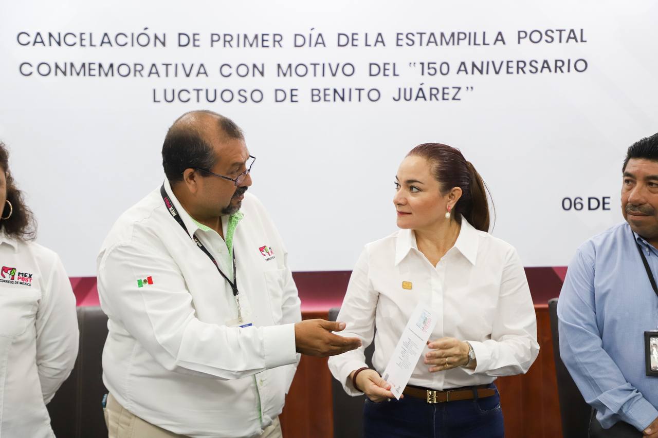 La presidenta municipal Juanita Alonso Marrufo recibió la hojilla filatélica en el marco de la ceremonia de cancelación de primer día de la estampilla postal conmemorativa con motivo del “150 Aniversario luctuoso de Benito Juárez”, timbre postal que será puesto en venta en 198 países de la Unión Postal Universal.