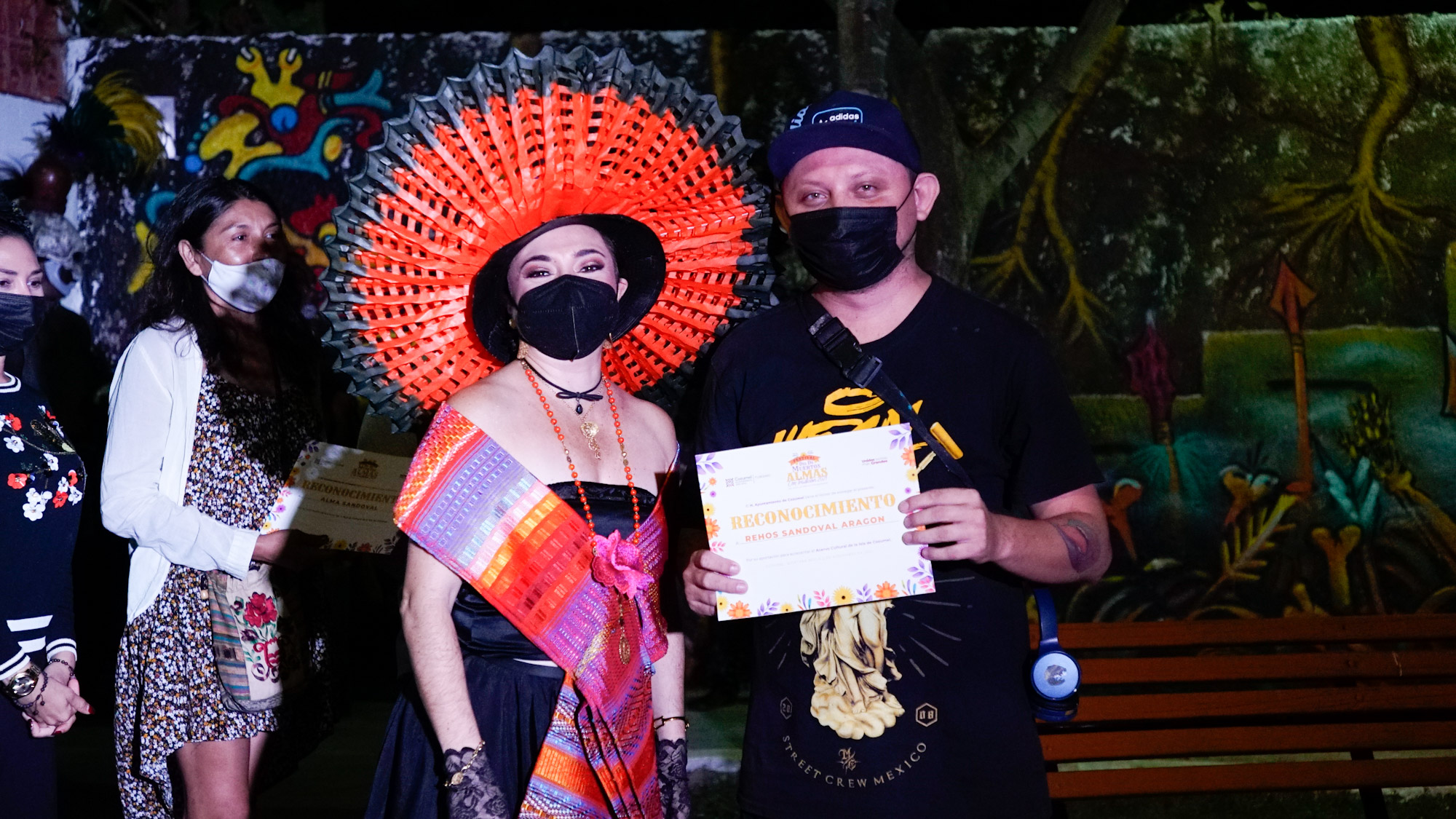 Como preámbulo al corte del listón inaugural de este mural, la presidenta municipal, Juanita Alonso Marrufo, emitió su mensaje en el que agradeció a los artistas urbanos Alma Sandoval, Lucio Frías y Rehos Sandoval, por plasmar en un tiempo muy corto su obra de arte con vistosas imágenes en torno al Día de Muertos, así como también agradeció al cronista de Cozumel, Veudi Vivas Valdez, por su participación y aportación en este evento.
