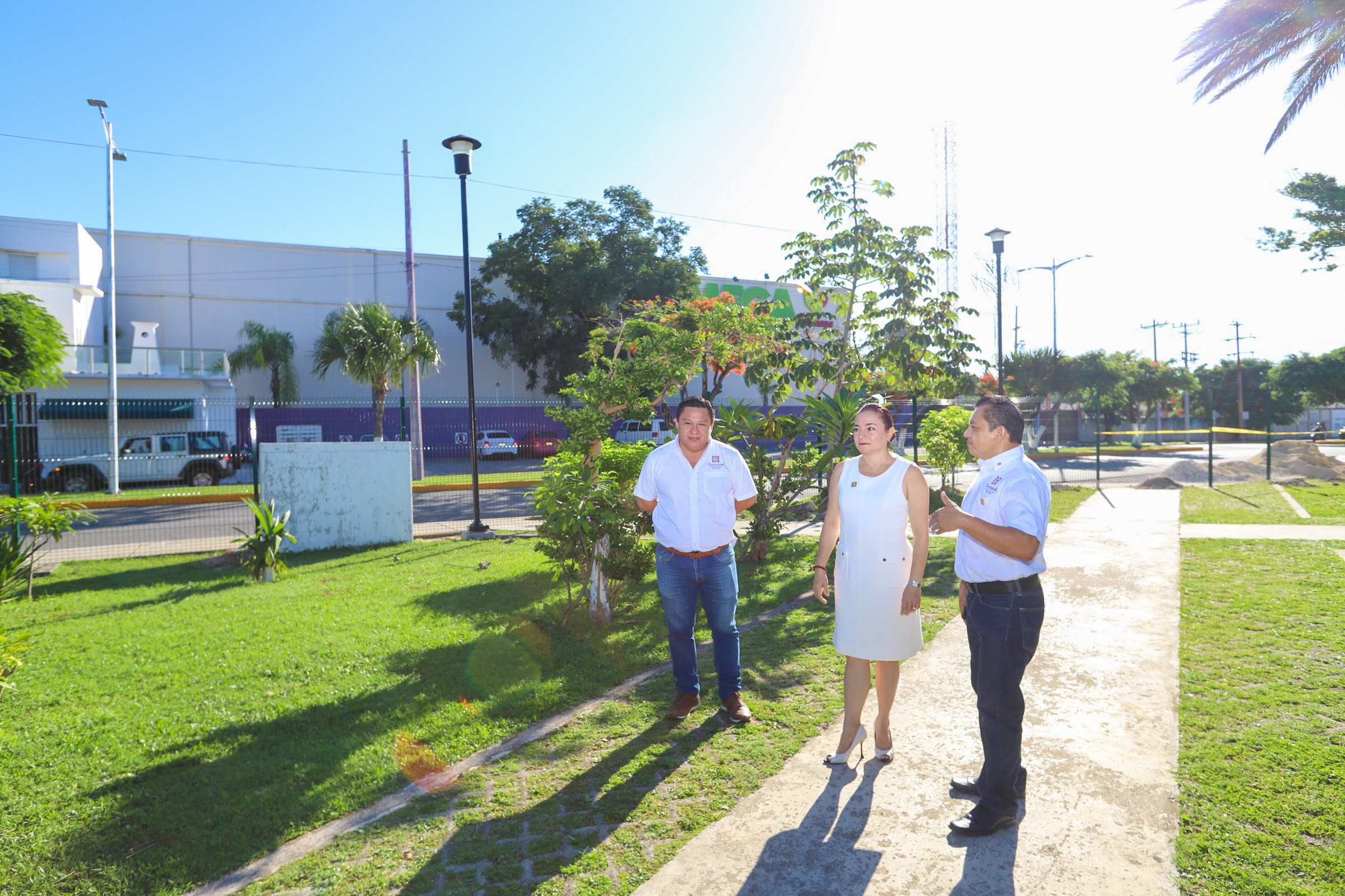 Por la mañana, la presidenta municipal acudió al parque Quintana Roo para verificar el avance de la obra de adecuación donde se construye un área canina, la cual incluye barda perimetral de protección con rejacero de dos metros de altura, suministro y colocación de juegos como banca, rampas, subibaja, barra de equilibrio, entre otros, además de contenedores de desechos e iluminación en el sitio.