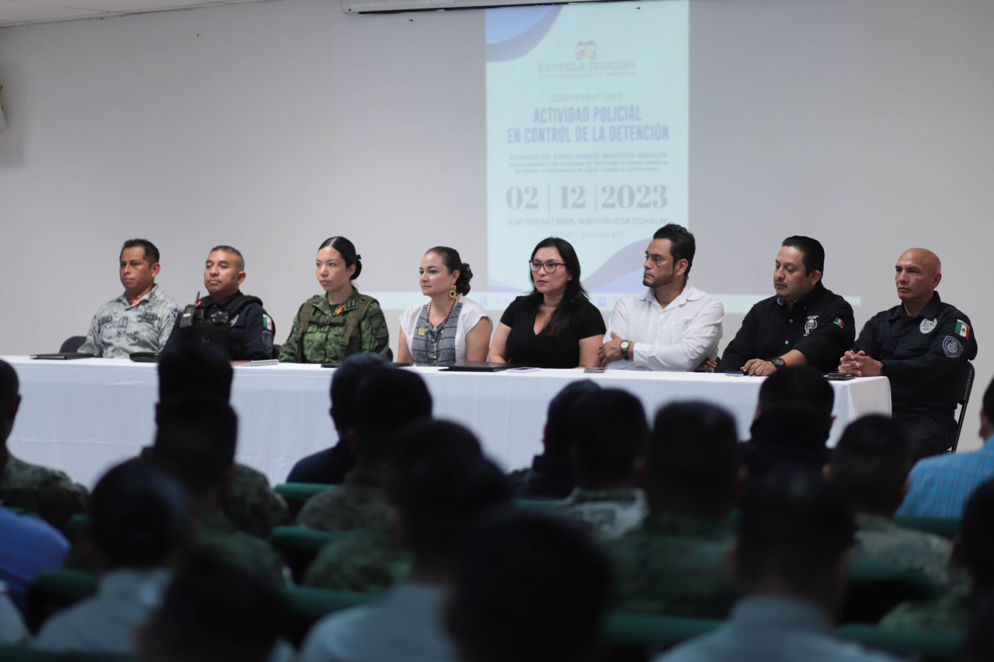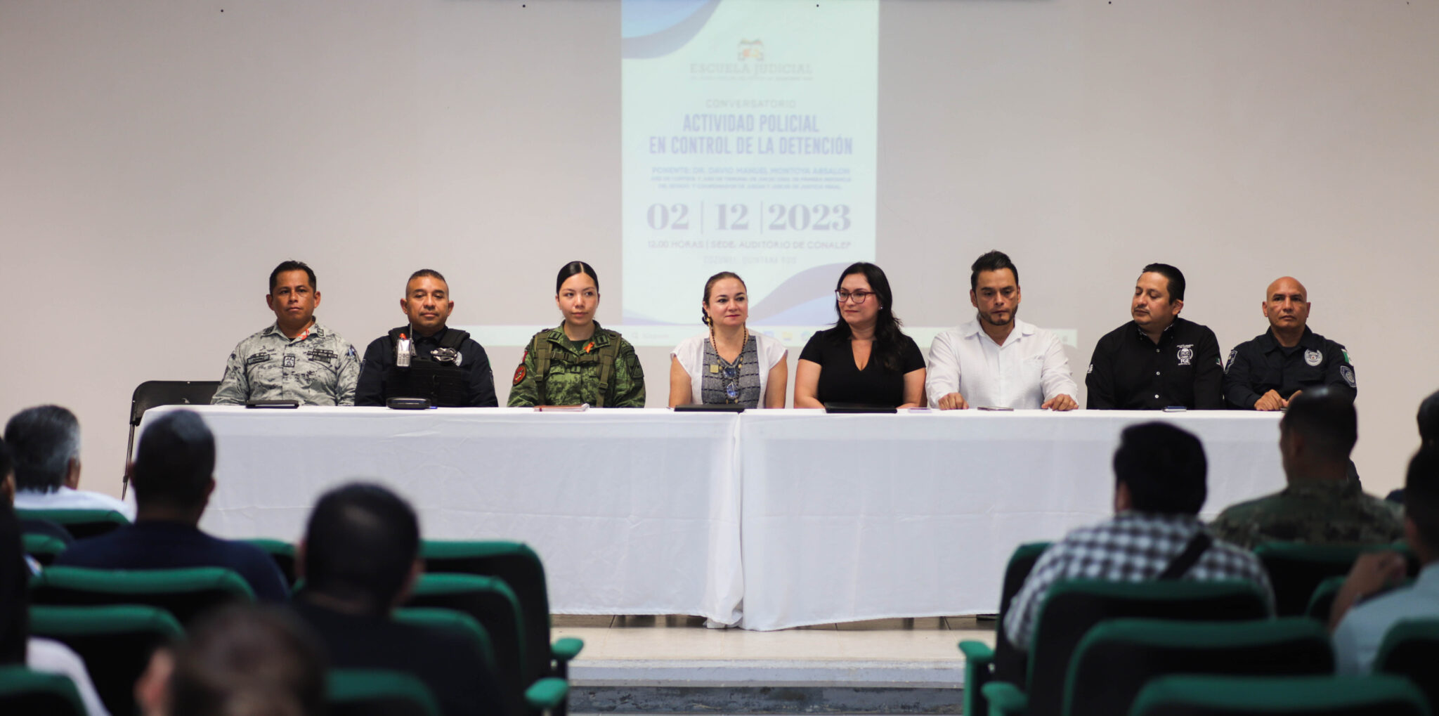 El evento se realizó en el auditorio del CONALEP plantel Cozumel, donde se reunieron autoridades civiles, militares y de procuración e impartición de justicia para participar en la ponencia magistral “Conservatorio de actividad policial en el control de la detención”, en el que alrededor de setenta asistentes escucharon atentamente y compartieron sus dudas con el ponente magistral, el Doctor David Manuel Montoya Absalón.