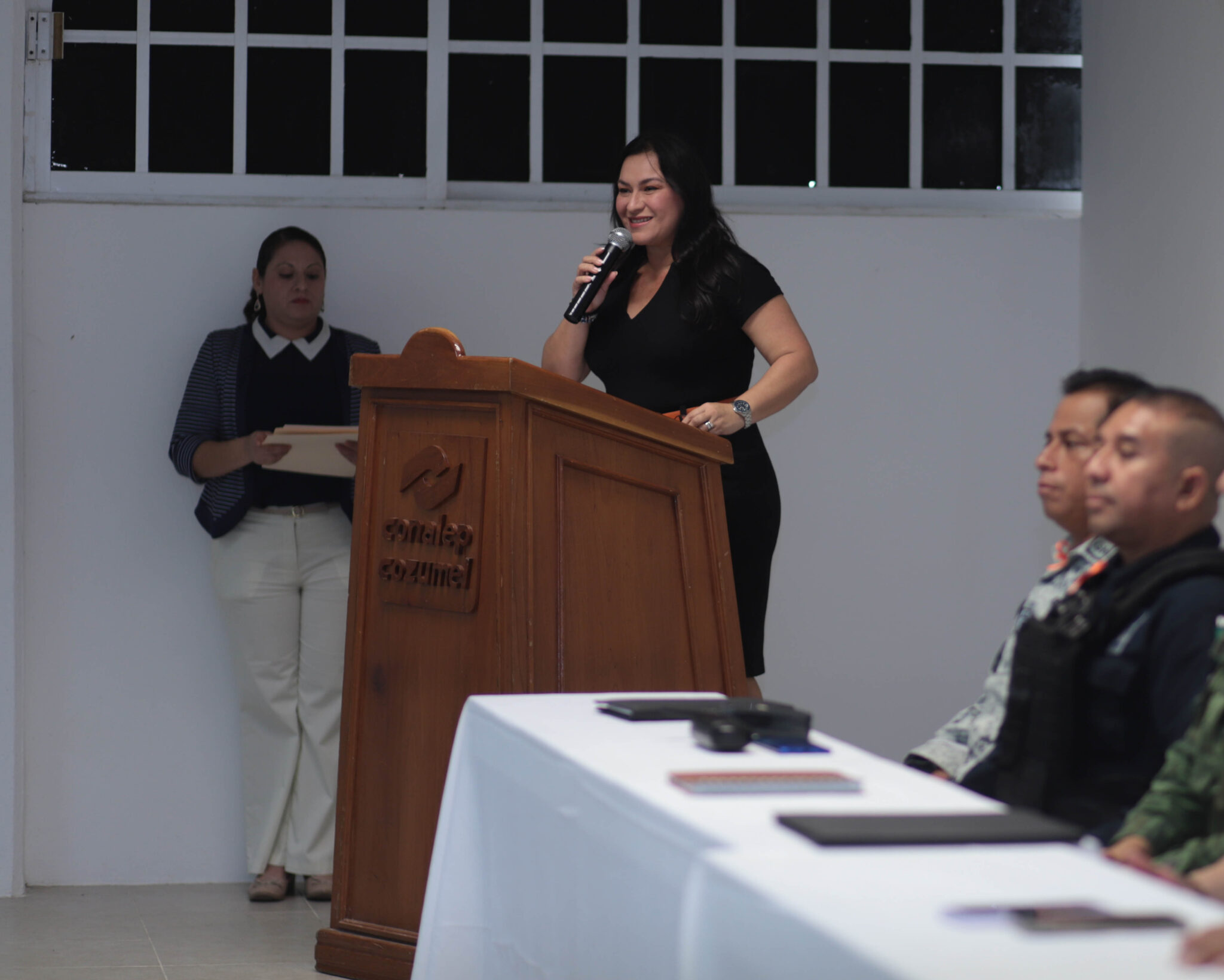 El presidium estuvo integrado por la presidenta municipal, Juanita Alonso Marrufo; la magistrada Adriana Cárdenas Aguilar, representante del Tribunal Superior de Justicia de Quintana Roo, en representación del comandante de la Guarnición Militar, Gral. Brigadier D.E.M. Oscar Olivares Miranda, la subteniente de sanidad Marisol Pérez Serrano; el Segundo subinspector Alberto Juárez Hernández, comandante de la 558 compañía de la Guardia Nacional; el inspector José Francisco Pool Navarro, Comandante del destacamiento de la policía estatal de Quintana Roo en Cozumel; licenciado Cristopher Sandoval Rosado, coordinador de ministerios públicos de la Fiscalía General del Estado en Cozumel; Primer Maestre Ismael García Vázquez en representación del capitán de corbeta infante de la marina, Luis Alberto Taylor González, director de Seguridad Pública y Tránsito municipal, y el ponente el Doctor David Manuel Montoya Absalón, juez de control y juez de tribunal de juicio oral de Primera Instancia del Estado y Coordinador de jueces de justicia penal.