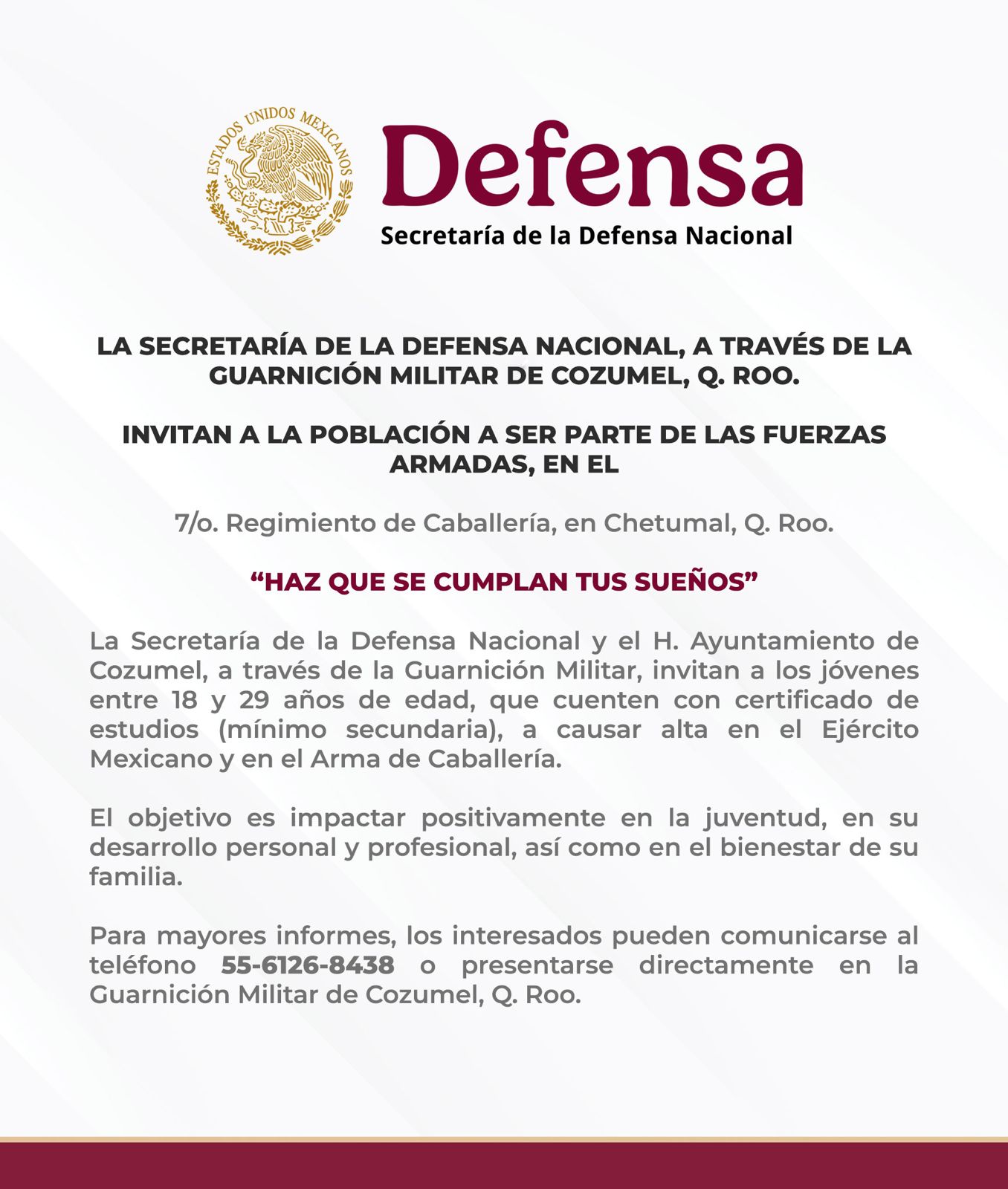 El Ejército mexicano ofrece a sus integrantes formación, estabilidad, oportunidades de superación y un proyecto de vida con sentido de propósito y orgullo nacional. Para mayores informes, los interesados pueden comunicarse al teléfono 55 6126 8438 o acudir directamente a las instalaciones de la Guarnición Militar de Cozumel, Quintana Roo.