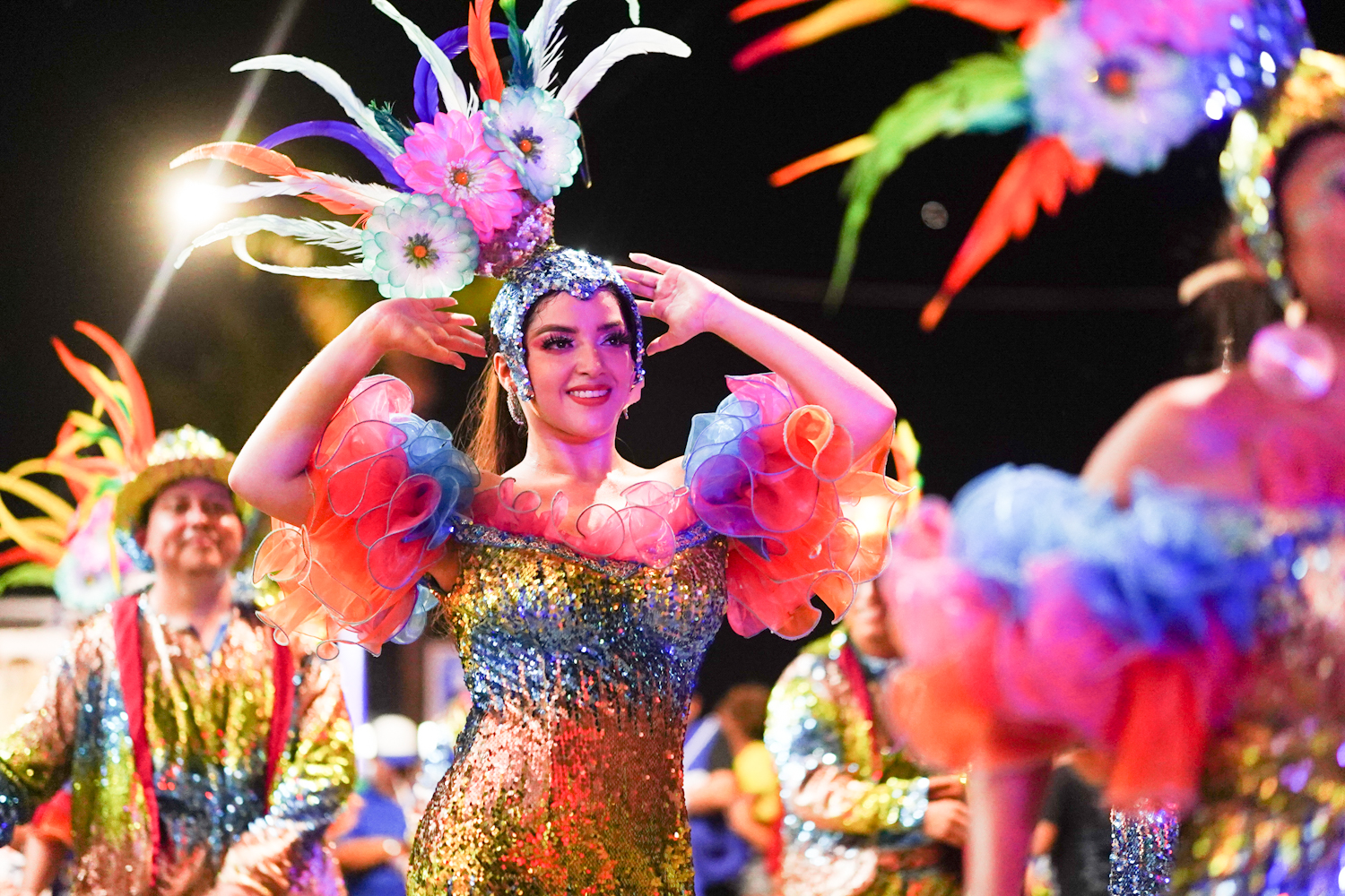 Cabe destacar que, en este derrotero la población tuvo la oportunidad de apreciar los carros alegóricos adornados con temáticas como selvas, florales, cisnes blancos, apaches, piratas, egipcios, toreros, cavernosaurios, entre otros, los cuales desfilaron sobre ambos sentidos viales de la avenida de la isla que fue engalanado con los acostumbrados fuegos artificiales.