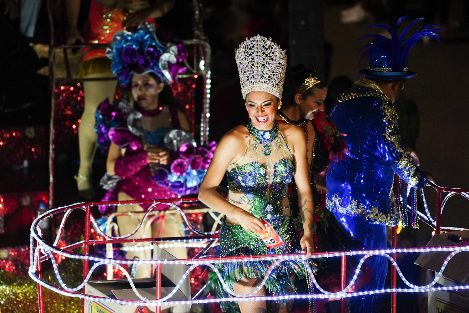El recorrido de los vistosos carros estuvo encabezado por los reyes del Carnaval Cozumel 2023, Regina Bernés y Jorge Ventura, seguidos por los diversos soberanos y la corte real de esta festividad, así como también vehículos de múltiples tamaños decorados con gran creatividad, algunos ambientaron su recorrido con música en vivo como el caso de la banda sinfónica de Cozumel y la Banda All Star, entre otros.