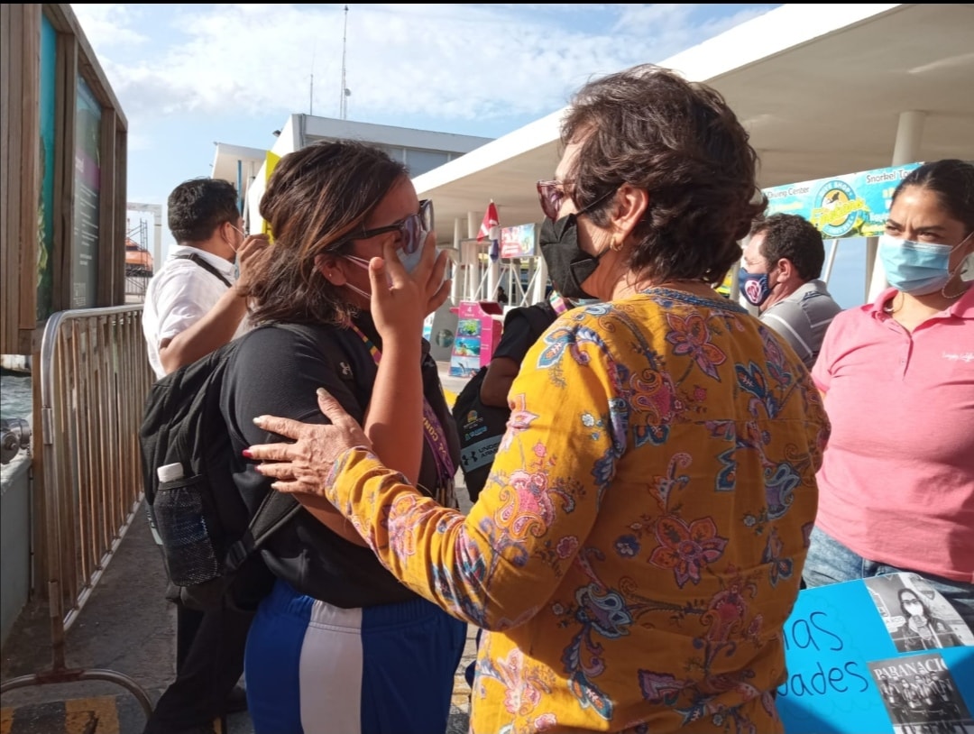 Los paratletas cozumeleños, Manuel Alamilla, Natalia Pérez, Guillermo Pisté y Michelle Pech fueron recibidos en el muelle San Miguel por Rosa Elena Zapata Vázquez, titular de la Dirección de Deportes y Atención a la Juventud, quien a nombre de la presidenta municipal, Juanita Alonso Marrufo y los habitantes de la isla felicitó a los jóvenes por su destacada participación.