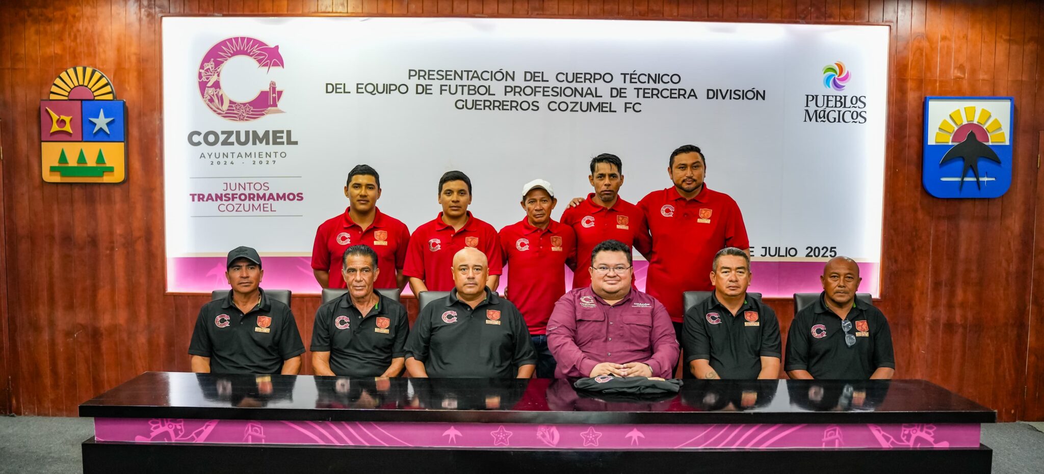 El gobierno municipal que encabeza José Luis Chacón Méndez, junto al director deportivo del club, Manuel García Valdés, presentó en conferencia de prensa al cuerpo técnico del equipo de fútbol profesional de tercera división Guerreros Cozumel FC, como parte del compromiso de la administración actual con el fortalecimiento del deporte y el impulso a los equipos semiprofesionales.