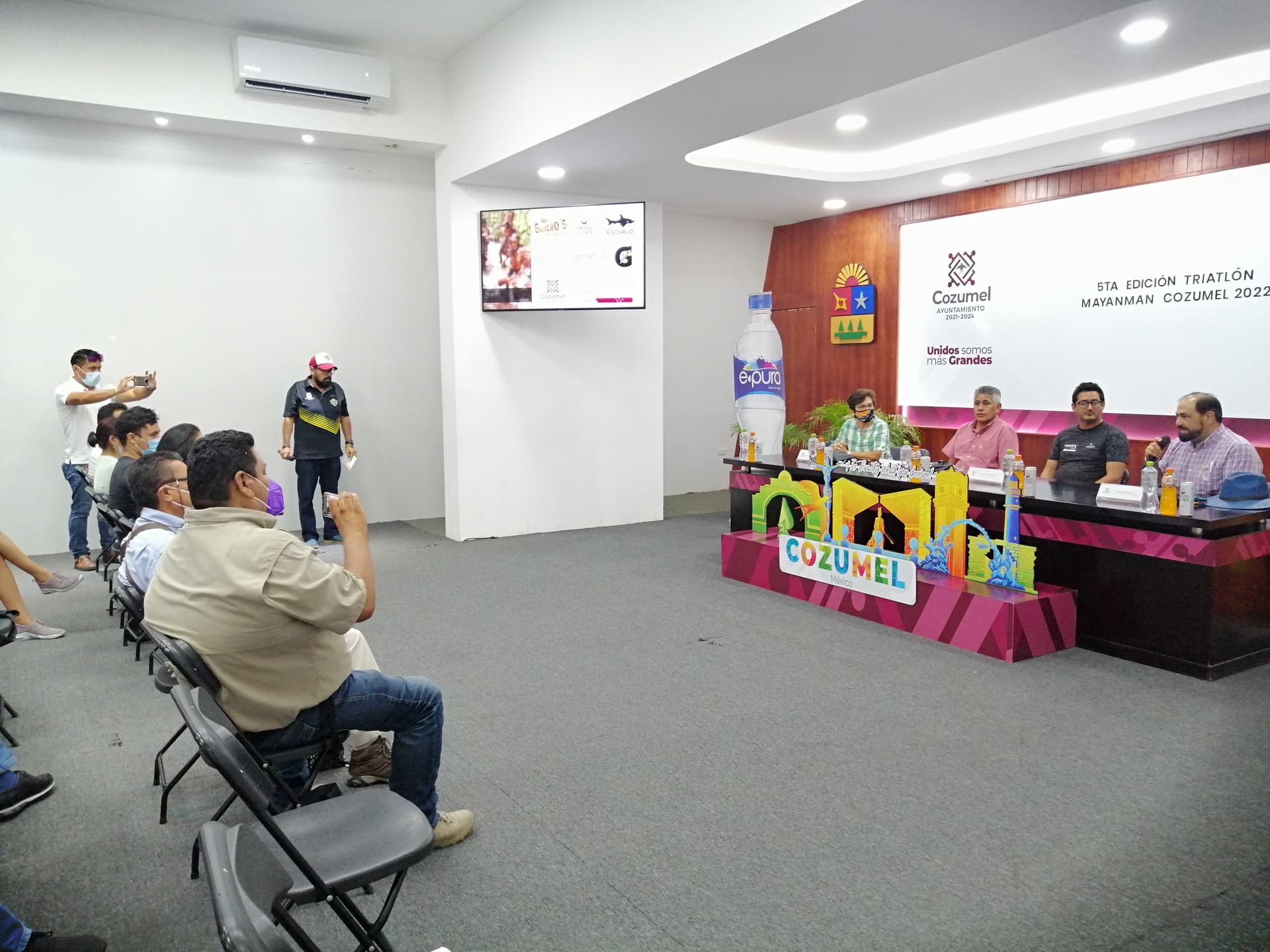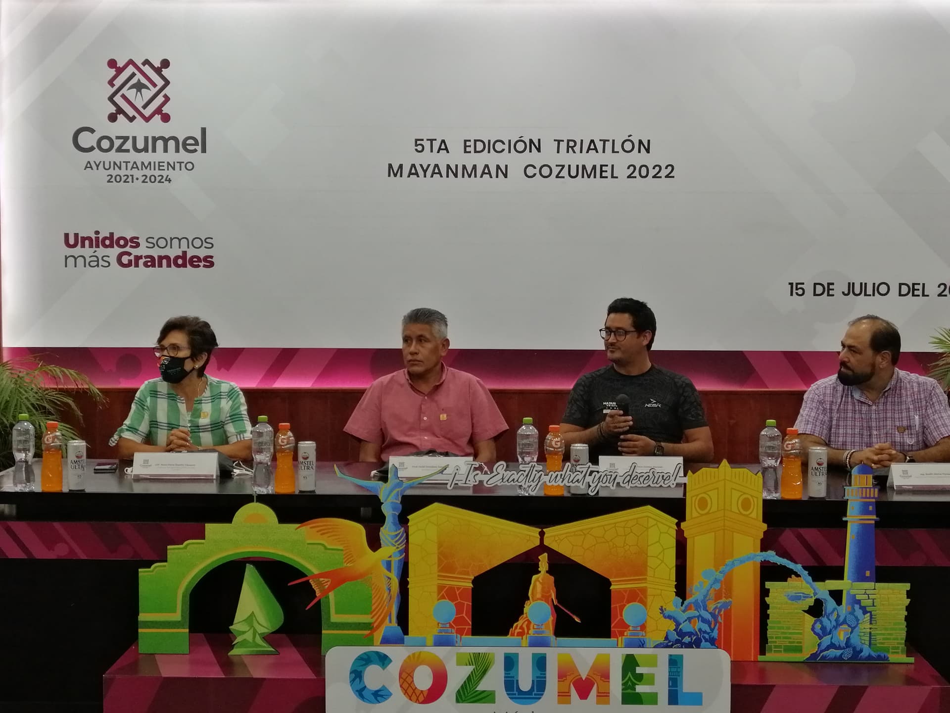 El Gobierno Municipal que preside Juanita Alonso Marrufo y el director general del Mayanman, Genaro Gómez Montiel, presentan la quinta edición del triatlón que se realizará por primera ocasión en Cozumel el próximo domingo 21 de agosto en las modalidades super sprint, sprint, 70.3 y relevos, con la participación de 600 triatletas nacionales, entre los que destaca el dos veces máximo ganador de esta competencia, el cozumeleño Alan Carrillo Ávila.