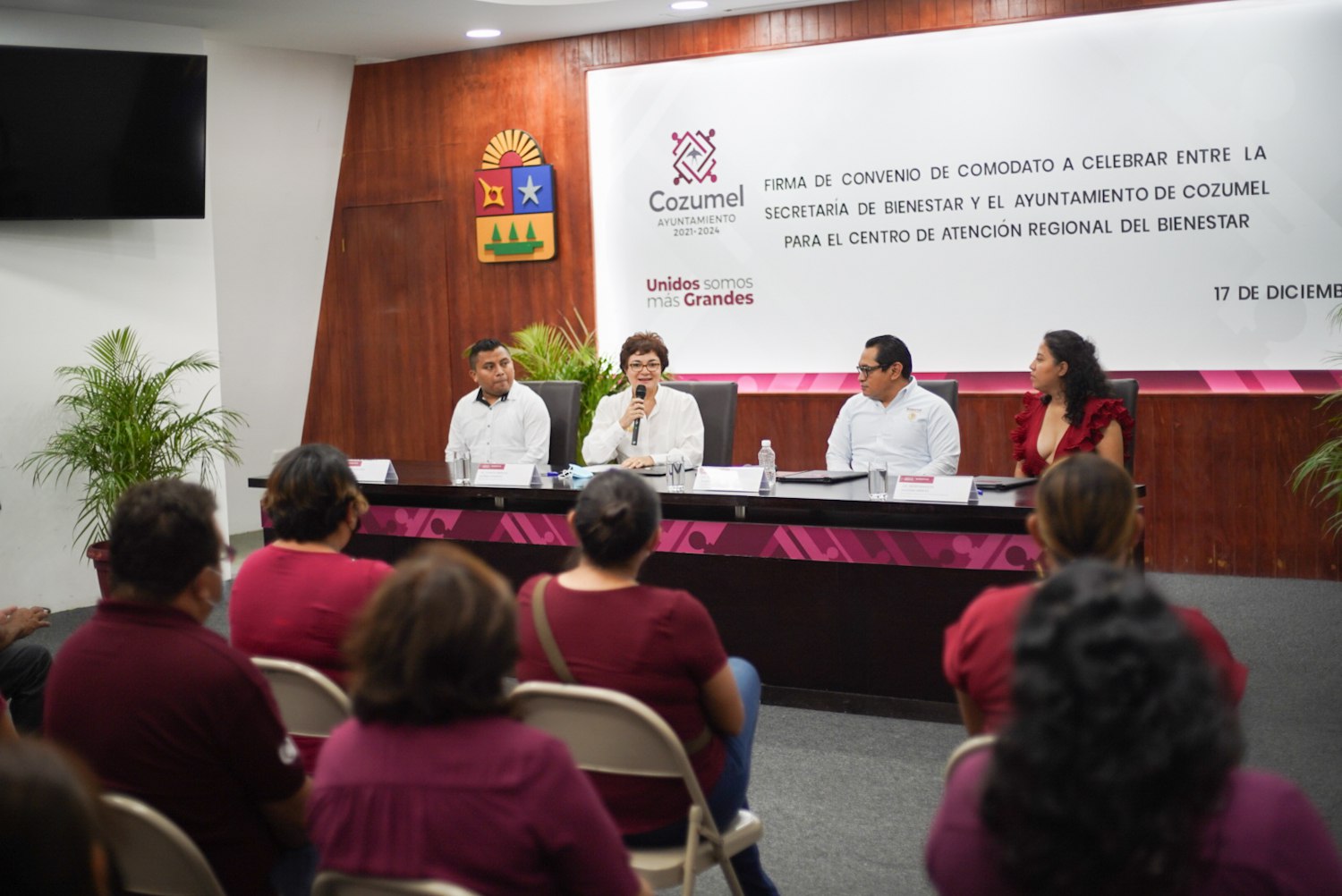 A fin de que Cozumel cuente con un Centro de Atención Regional del Bienestar, la presidenta municipal Juanita Alonso Marrufo, llevó a cabo esta mañana la firma correspondiente al convenio de comodato con funcionarios estatales y regionales de la Secretaría de Bienestar para que de esta manera acercar los programas a mayor número de habitantes de Cozumel.