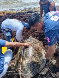 La tortuga, de aproximadamente 1.40 metros de longitud y un peso estimado de 190 kilogramos, fue localizada atrapada en un pequeño hoyo entre formaciones rocosas, lo que impedía su movilidad y ponía en riesgo su vida.