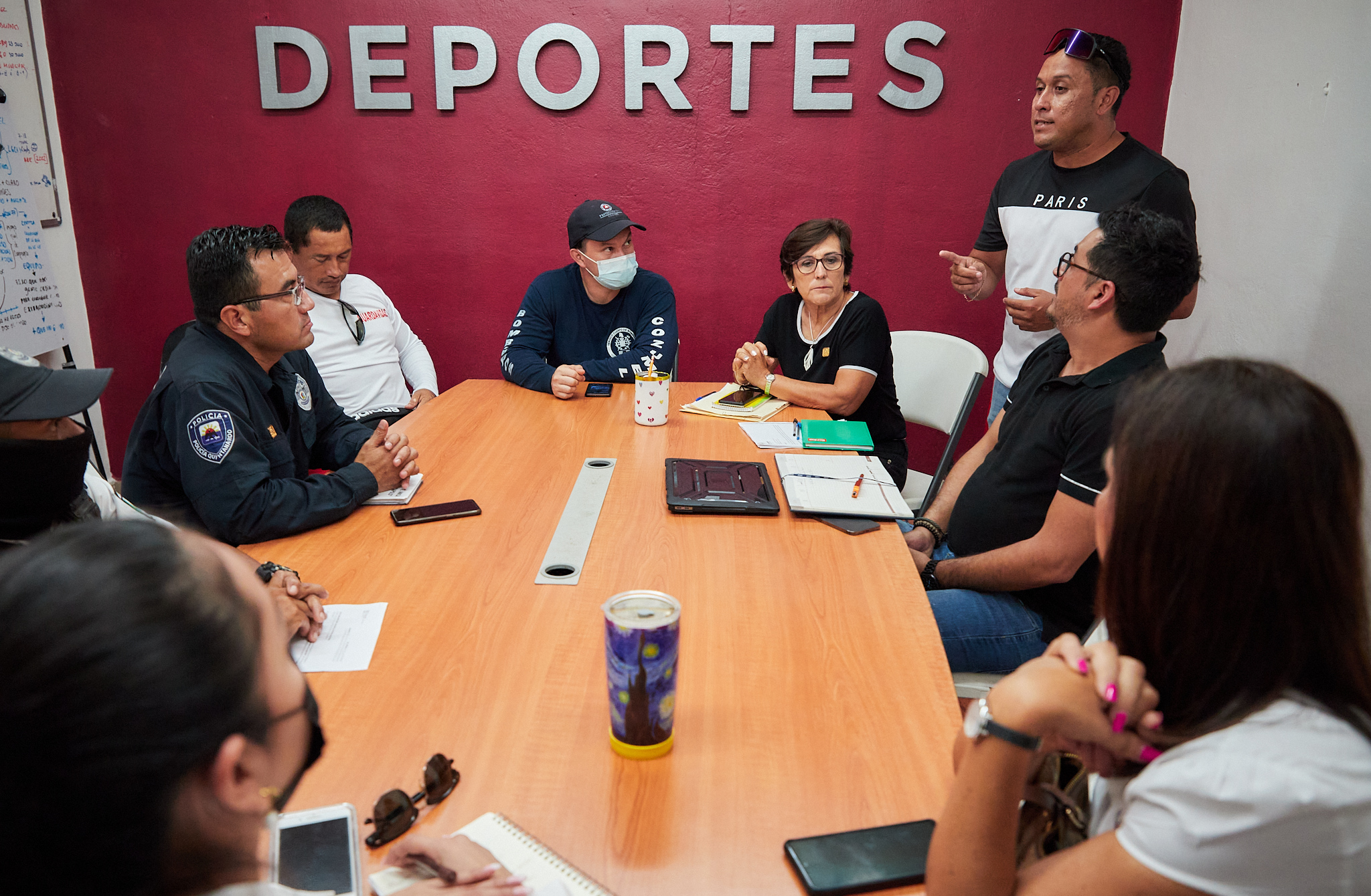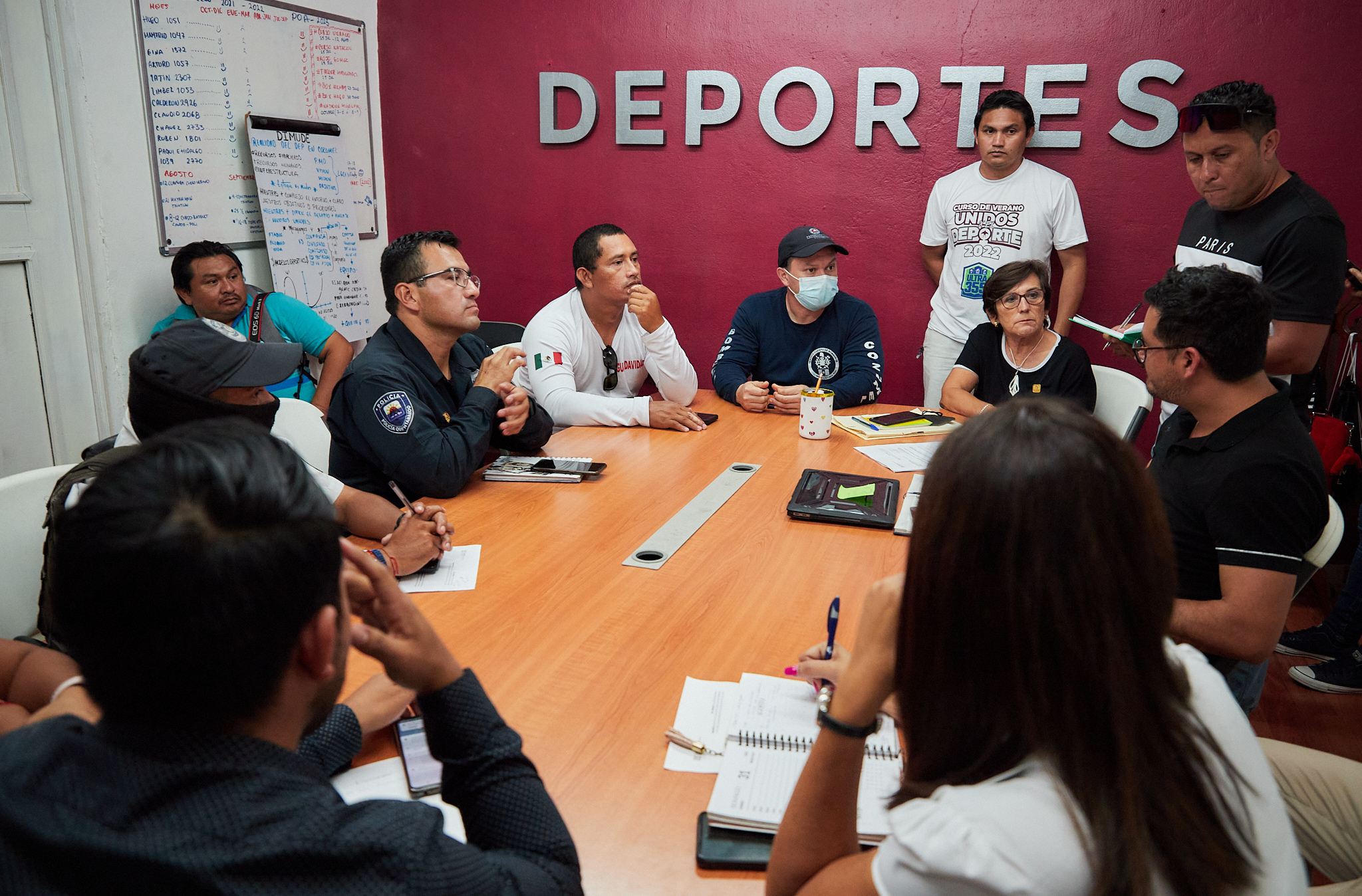 Titulares de las diversas dependencias del Gobierno Municipal que preside Juanita Alonso Marrufo se reunieron con Genaro Gómez Montiel director general del Triatlón Mayanman, para afinar detalles previos a la competencia que se llevará a cabo el próximo domingo 21 de agosto en el que se contará con la participación de 600 triatletas.
