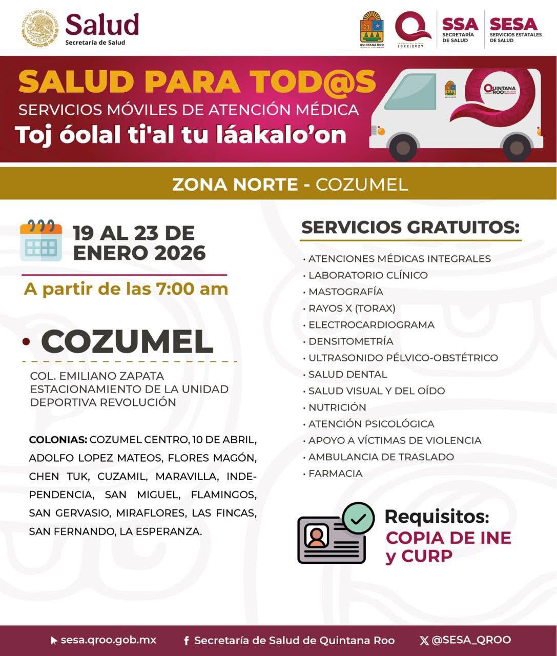 Estas acciones forman parte del trabajo coordinado entre el gobierno municipal y el gobierno del Estado que encabeza Mara Lezama, enfocado en fortalecer la prevención, el cuidado de la salud y la atención integral de la población, por lo que se exhorta a las y los ciudadanos a asistir con copia de su INE y CURP, y aprovechar que del 19 al 23 de enero las caravanas estarán al servicio de las familias cozumeleñas.