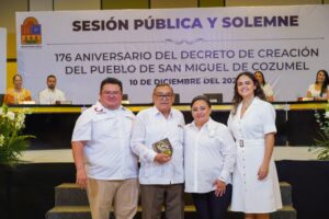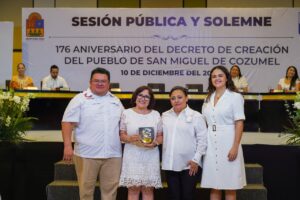 Asimismo, dio la explicación de la entrega de los reconocimientos al Mérito Artístico, Cultural y Social de Cozumel y el reconocimiento a la mujer cozumeleña, detalló que éste es un galardón destinado a destacar la labor, el compromiso y la contribución de mujeres que han impulsado el desarrollo y fortalecimiento de la comunidad y un homenaje para celebrar a quienes, con dedicación excepcional, promueven la identidad, cultura y bienestar de la isla, convirtiéndose en ejemplo e inspiración para las nuevas generaciones al subrayar el papel fundamental de las mujeres en la vida social, cultural y económica de Cozumel.
